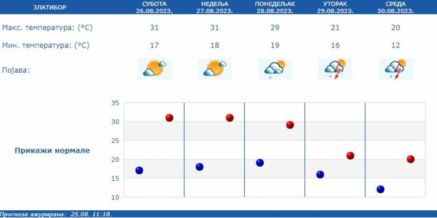 Od srede promenljivo oblačno i svežije sa povremenim pljuskovima i grmljavinom.