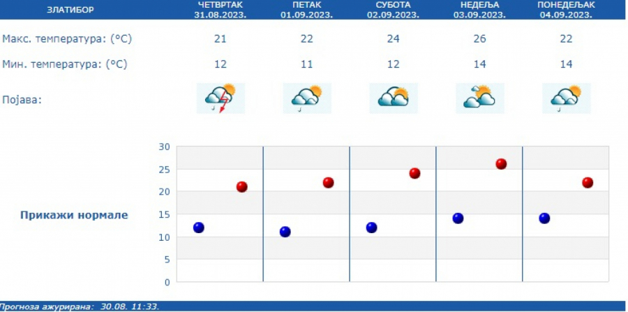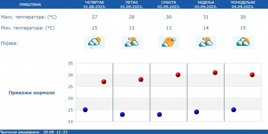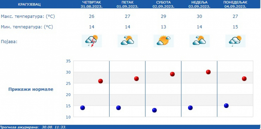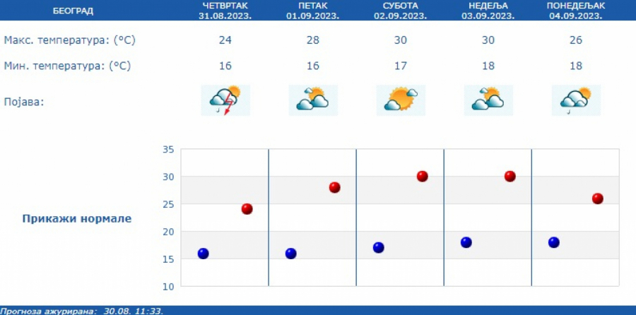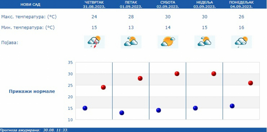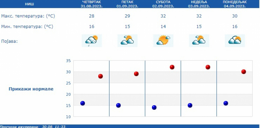 Prema prognozi Republičkog hidrometeorološkog zavoda (RHMZ), najniža temperatura iznosiće od 12 do 16, a najviša dnevna od 24 do 29 stepeni.