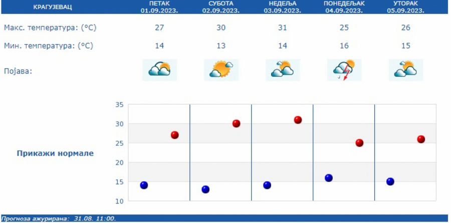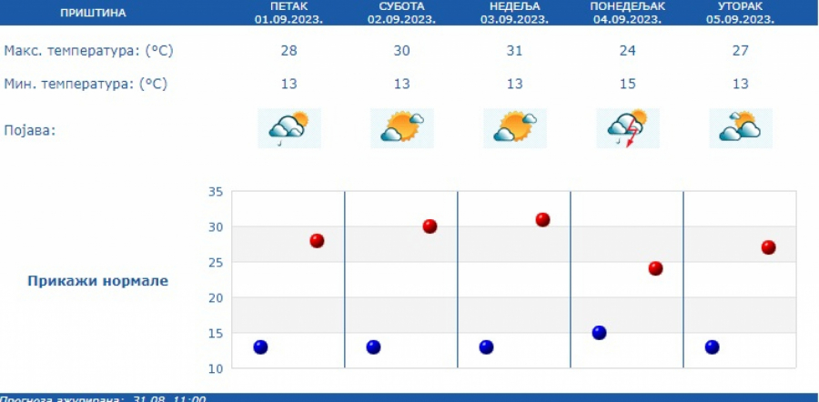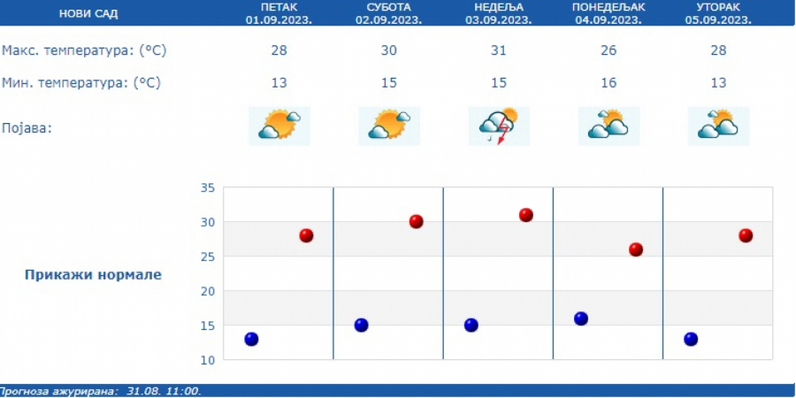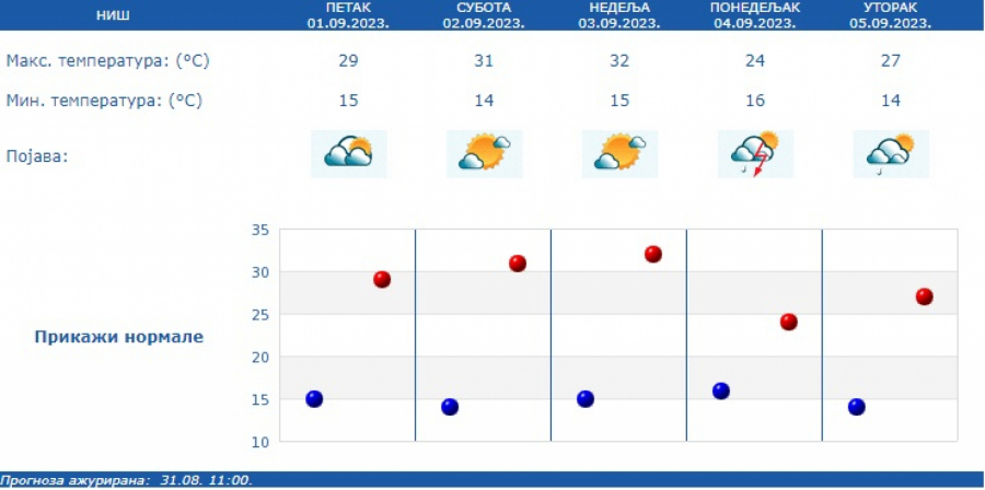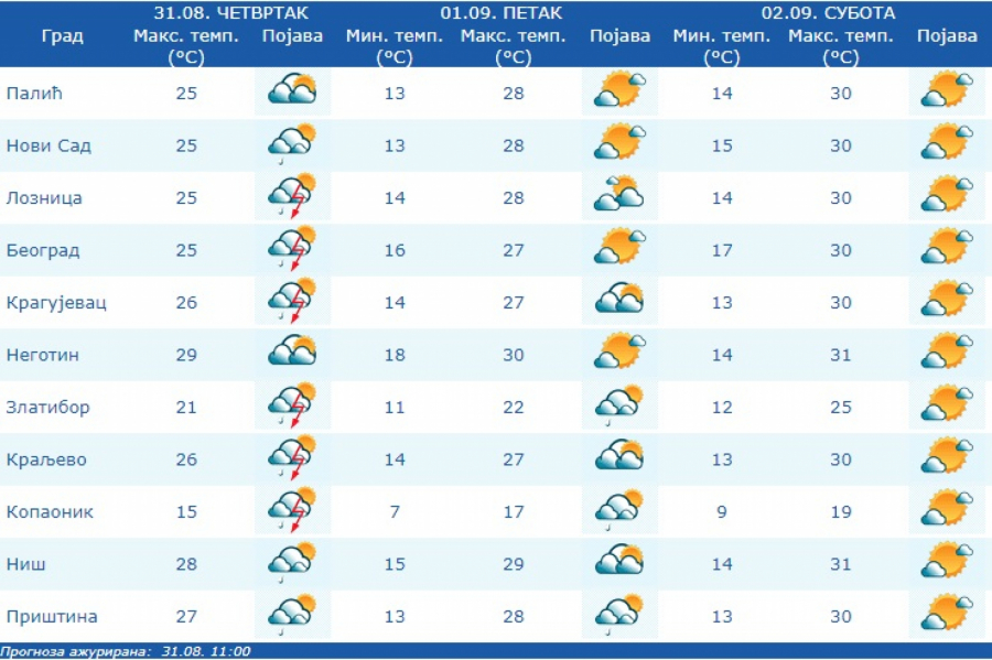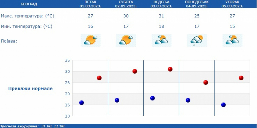 Vetar slab, promenljiv. Prema prognozi Republičkog hidrometeorološkog zavoda (RHMZ), najniža temperatura biće od 12 do 18, najviša od 26 do 30 stepeni.