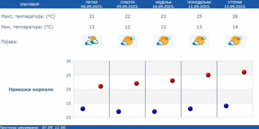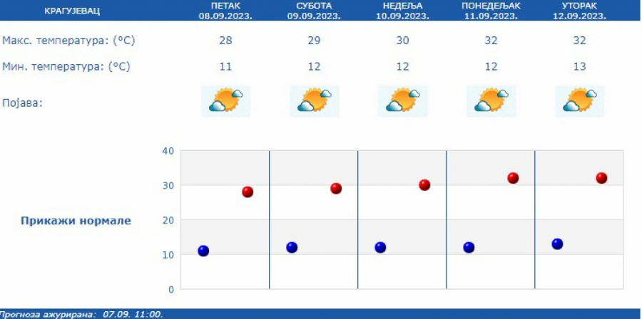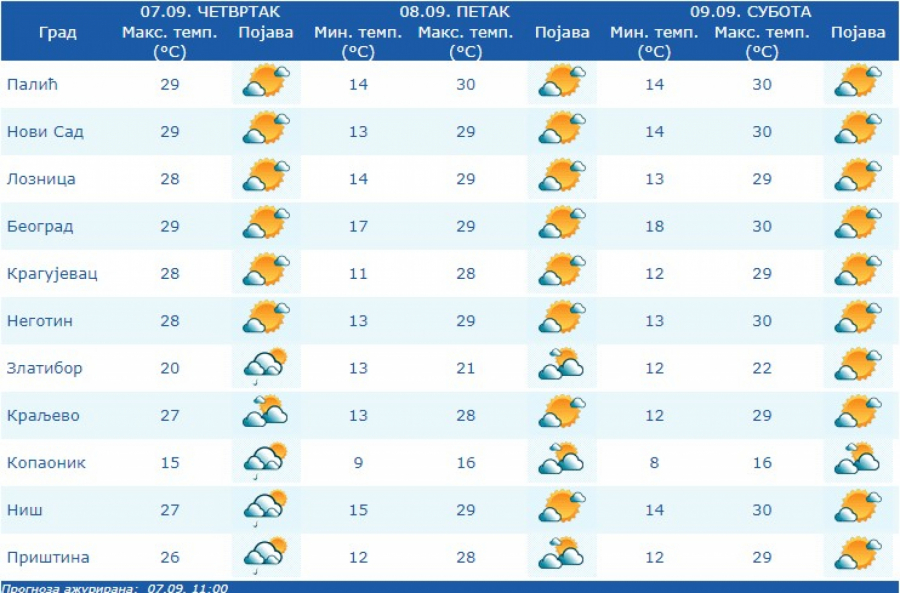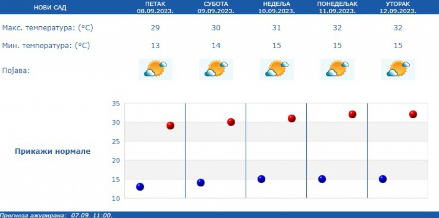 Prema prognozi za narednih sedam dana, u Srbiji će biti pretežno sunčano i postepeno toplije, sa dnevnom temperaturom u većini mesta od 29 do 33 C.