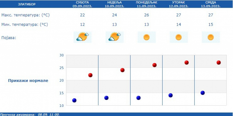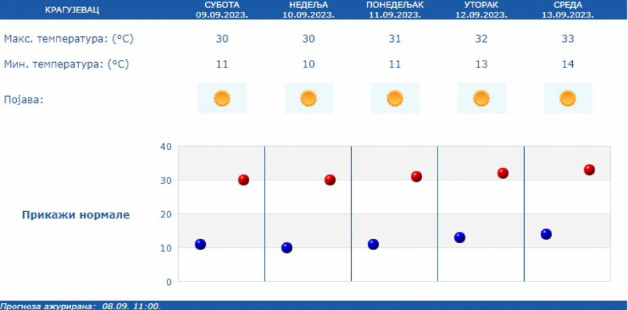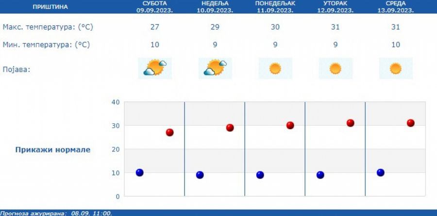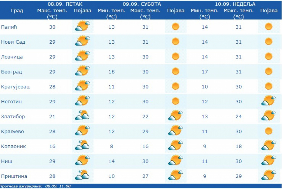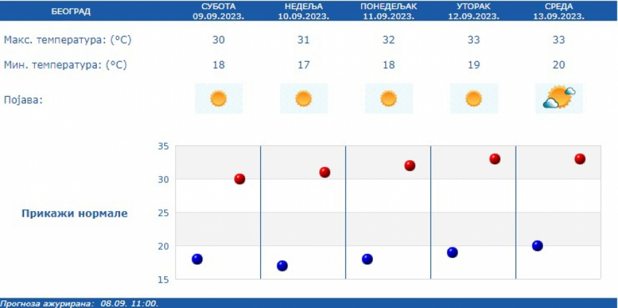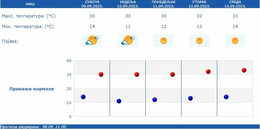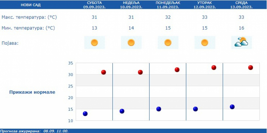 Najniža temperatura biće od 10 do 18, najviša dnevna od 27 do 31 stepen.