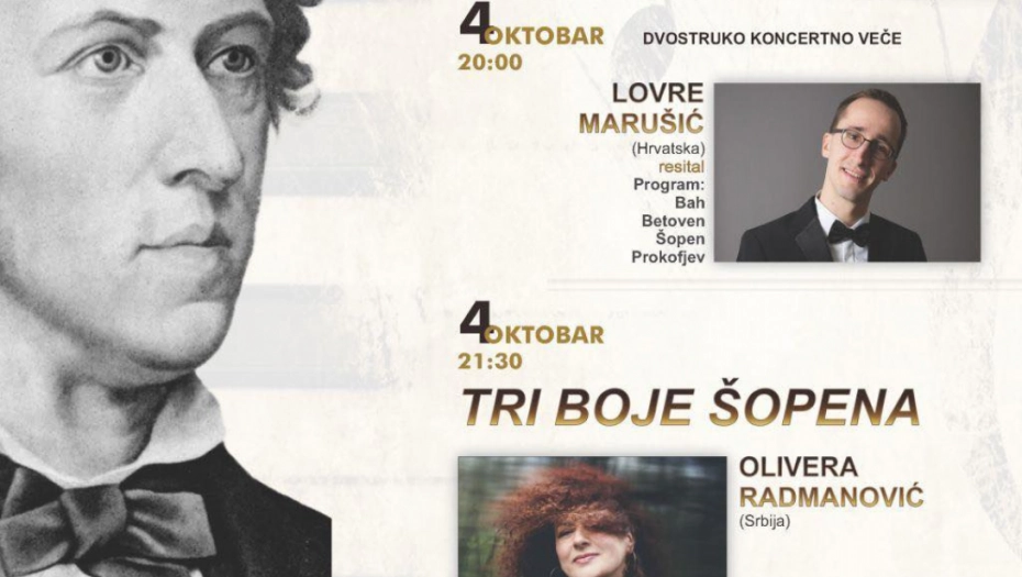 U sredu, 4. oktobra, biće održano dvostruko koncertno veče. U 1. delu večeri nastupiće hrvatski pijanista Lovre Marušić, a u 2. delu publika će čuti vrsne srpske pijaniste Oliveru Radmanović, Ljiljanu Vukelju i Nevena Šobajića u okviru koncerta Tri boje Šopena. Istoimani koncert biće izveden i u novosadskoj Sinagogi u petak, 6. oktobra. Četvrtak, 5. oktobar rezervisan je za Koncertno veče u Ustanovi kulture Gvarnerijus.