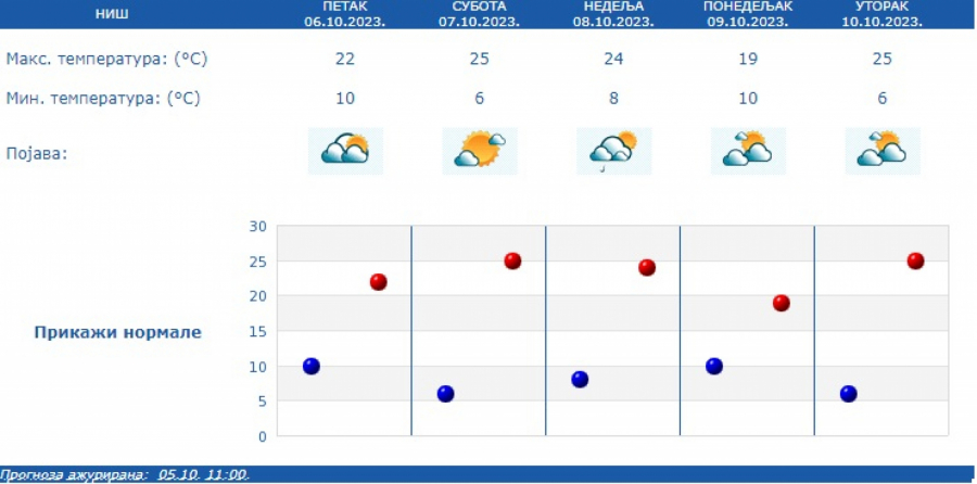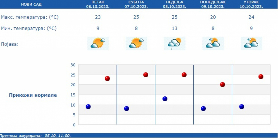 Najniža temperatura od 7 do 13, a najviša dnevna od 21 do 25 stepeni, saopštio je Republički hidrometeorološki zavod.
