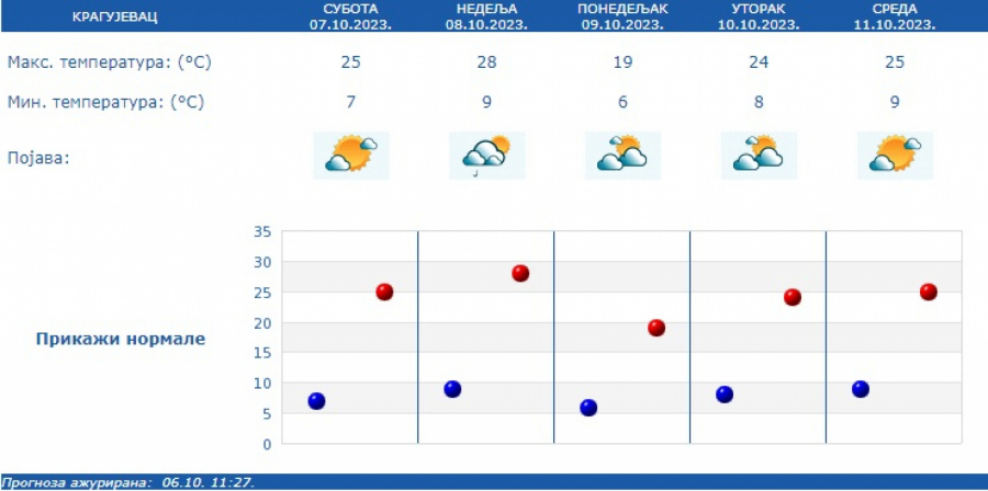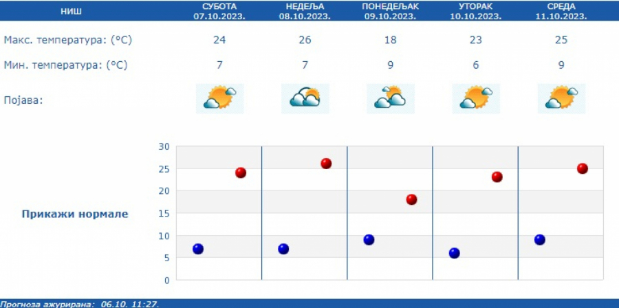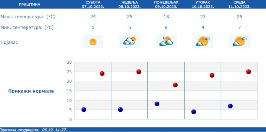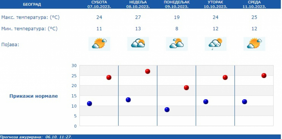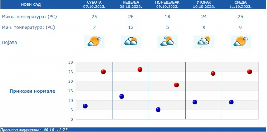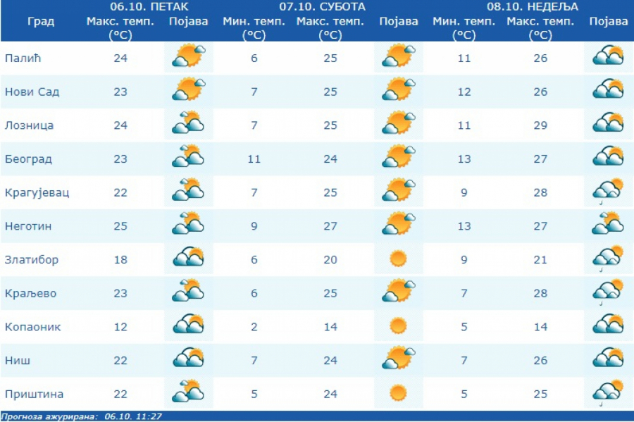 Tokom dana pretežno sunčano uz malu do umerenu oblačnost. Dnevna temperatura u većini mesta od 23 do 27 stepeni Celzijusa, osim u ponedeljak, kada će biti osetno hladnije.