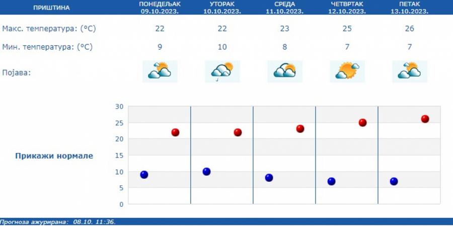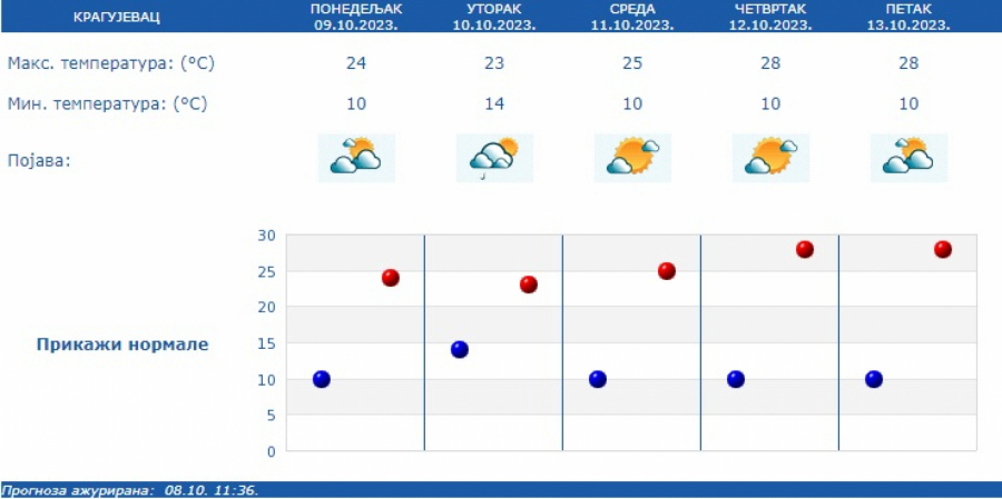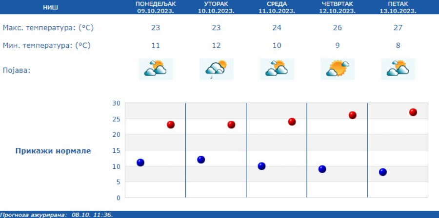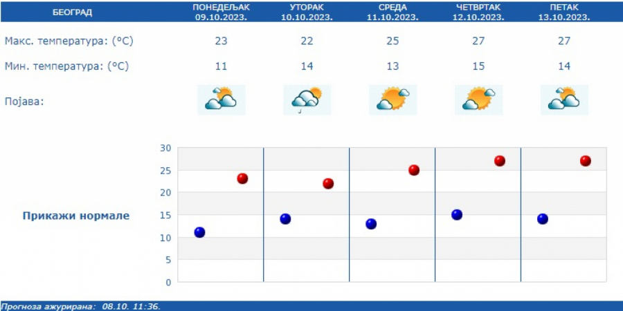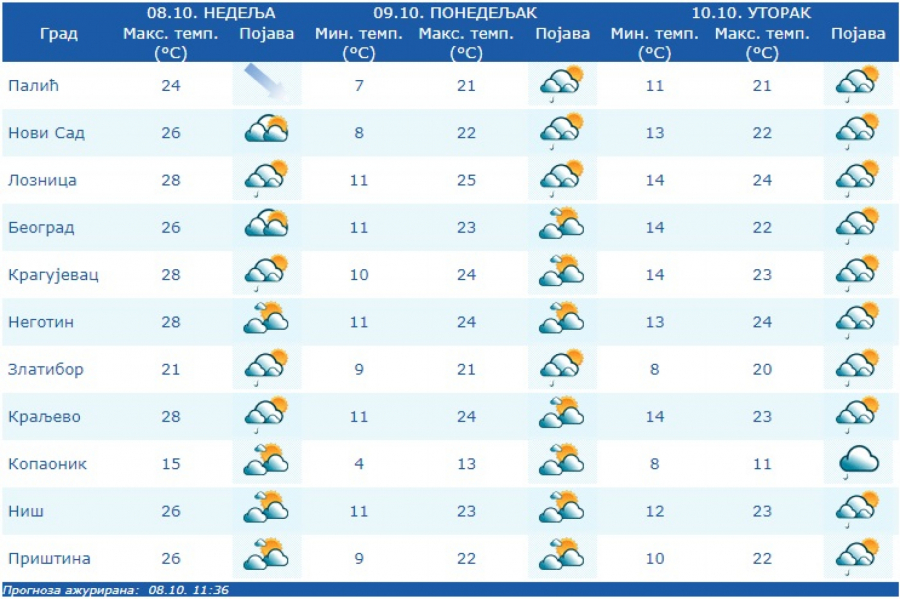 Tokom dana do 16. oktobra pretežno sunčano uz malu do umerenu oblačnost i toplo, sa dnevnom temperaturom u većini mesta od 23 do 28 stepeni.