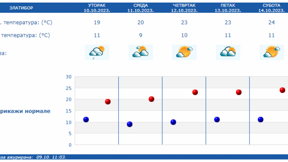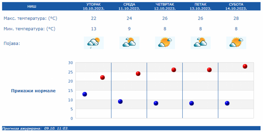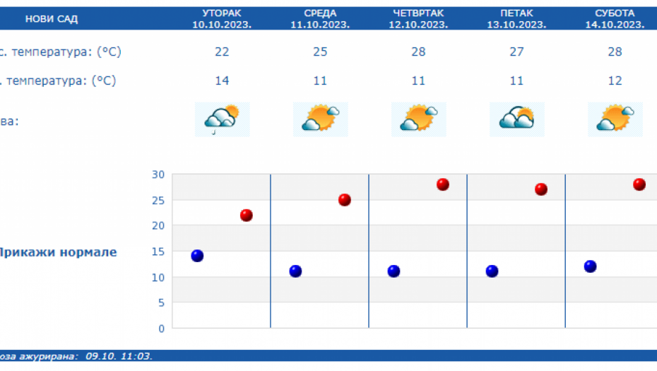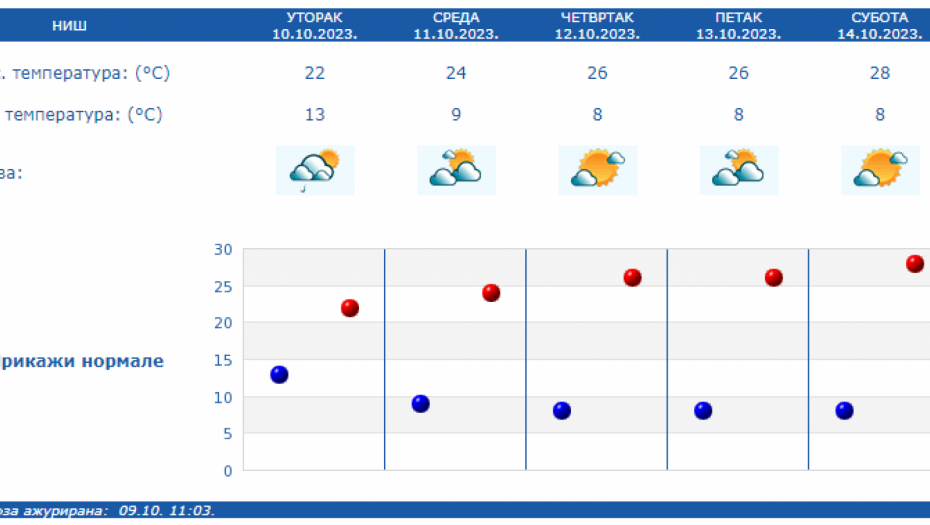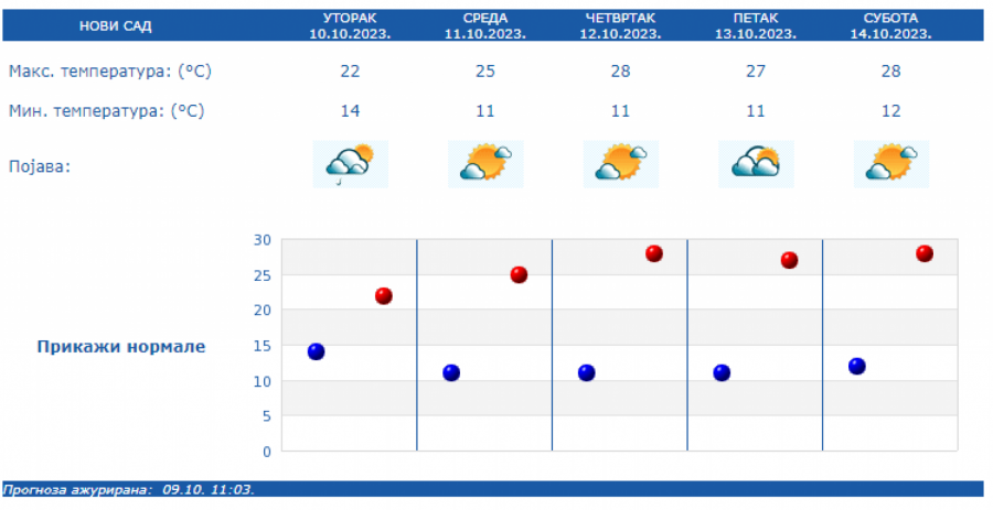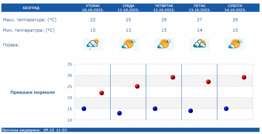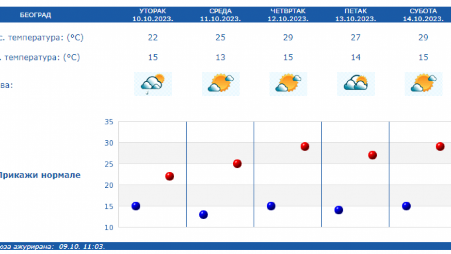 U Srbiji od srede do kraja sedmice jutra sveža, a tokom dana pretežno sunčano i toplije sa maksimalnim temperaturama od četvrtka od 24 do 29 stepeni, samo se u petak očekuje prolazno umereno naoblačenje bez padavina.