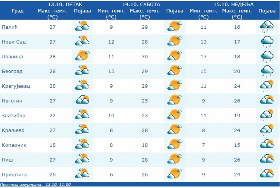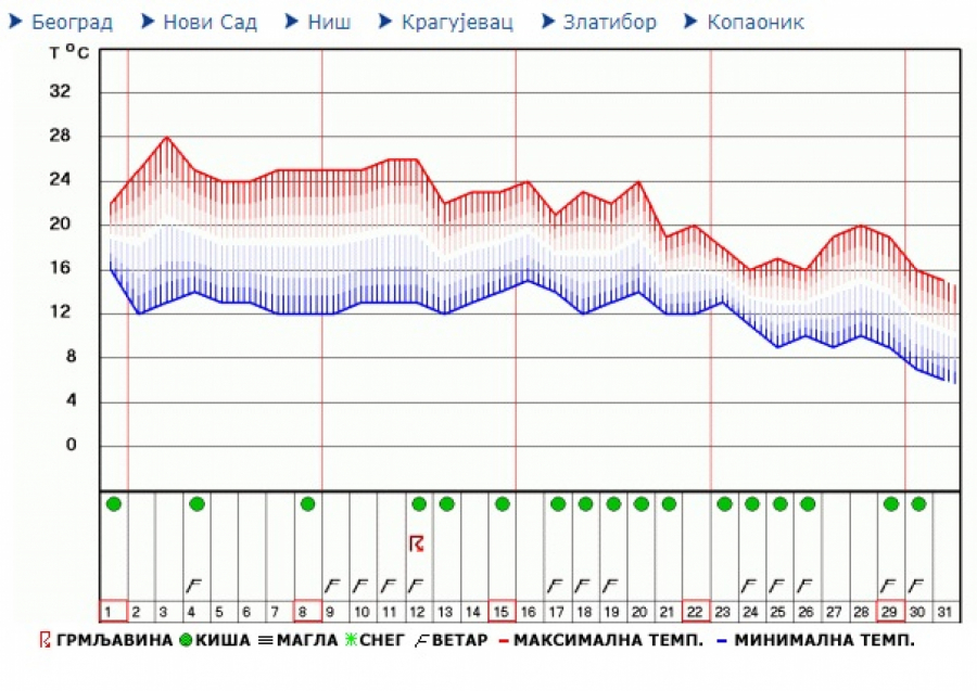 Vetar slab i umeren, južni i jugozapadni. Najniža temperatura od 4 do 15 °C, a najviša od 25 °C na istoku do 30 °C na zapadu Srbije, saopštio je Republički hidrometeorološki zavod.