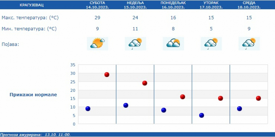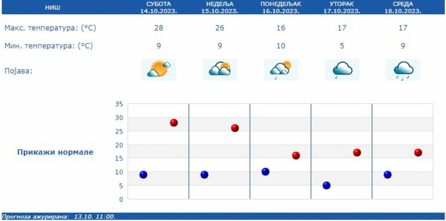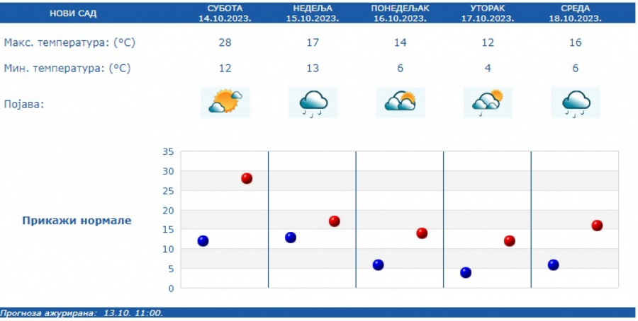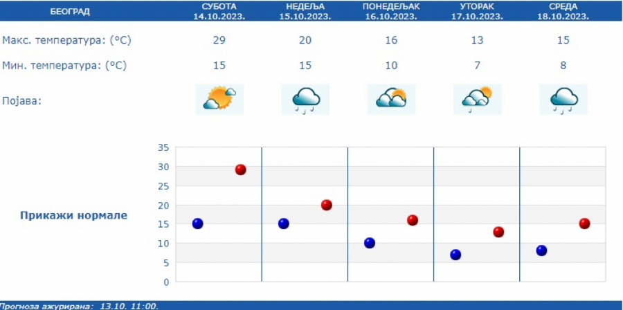 Prema prognozi za narednih sedam dana, u Srbiji će u nedelju doći do jačeg naoblačenja s kišom, lokalnim pljuskovima, jakim severozapadnim vetrom i padom temperature, koje će ujutro i pre podne zahvatiti severne i zapadne krajeve Srbije, a po podne i uveče će se proširiti na celu zemlju.