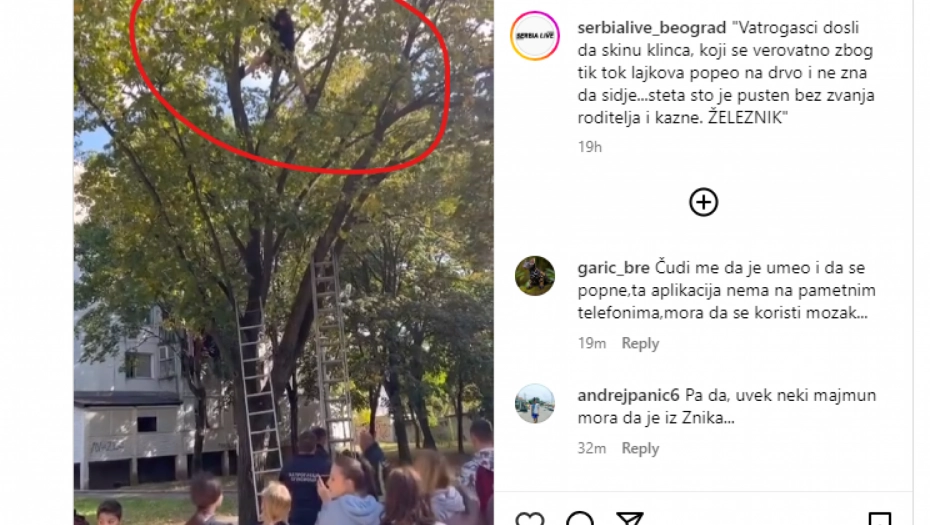 "Vatrogasci dosli da skinu klinca, koji se verovatno zbog tik tok lajkova popeo na drvo i ne zna da sidje...steta sto je pusten bez zvanja roditelja i kazne", ovako je situaciju prokomentarisao korisnik Instagrama koji je poslao snimak ovoj stranici, a ispod su se nizali komentari.