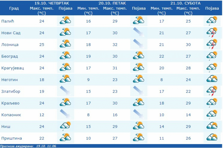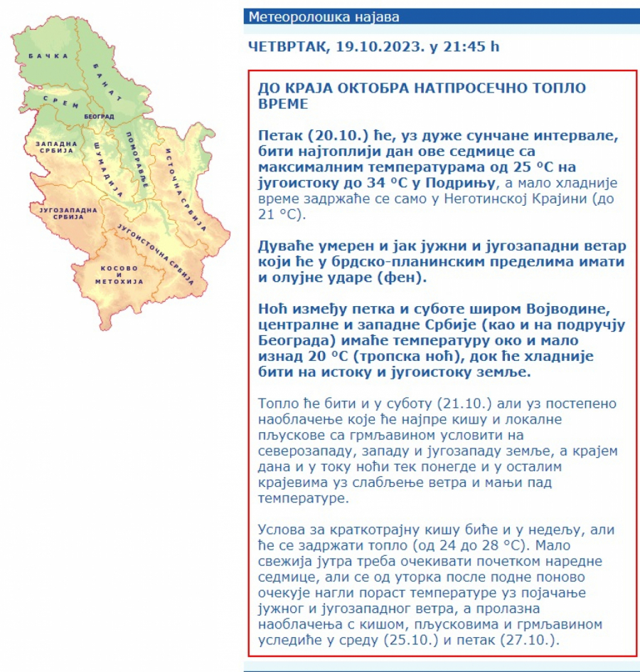Tokom dana biće toplo uz postepeno naoblačenje, pre podne i sredinom dana na severu, zapadu i jugozapadu, a uveče i tokom noći i u ostalim krajevima, mestimično sa kišom i pljuskovima ponegde i grmljavinom, manjim padom temperature i slabljenjem vetra.