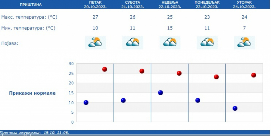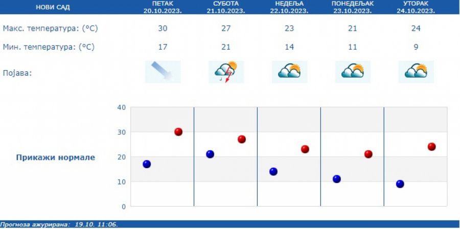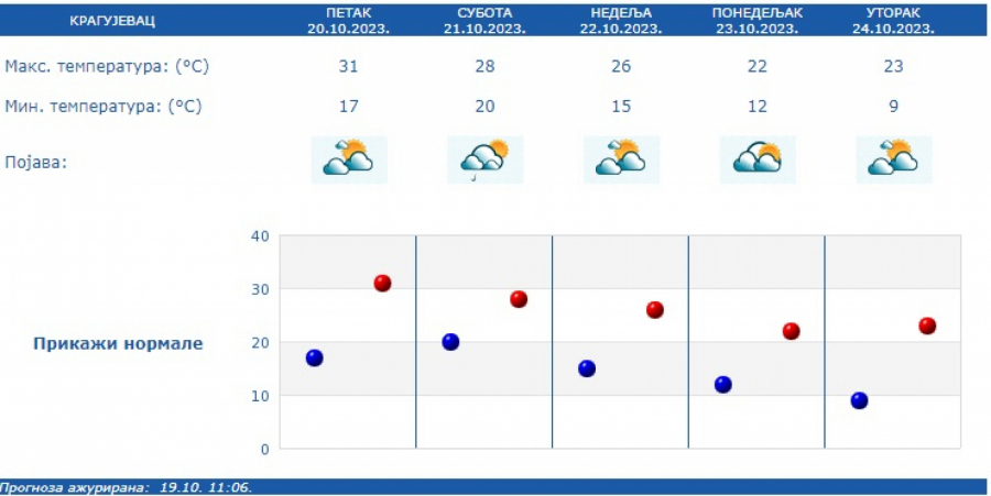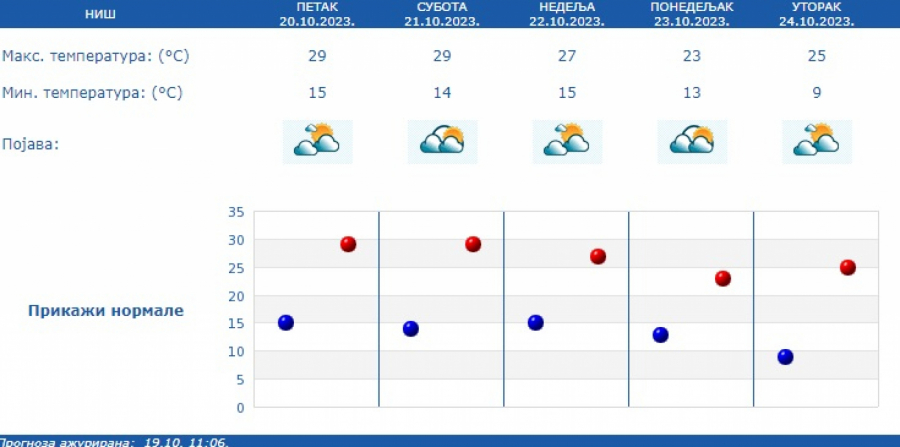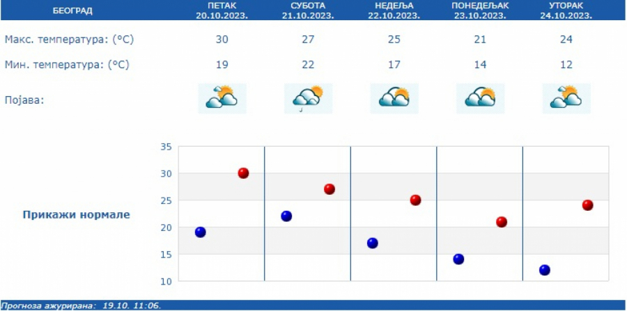 Najniža temperatura od 8 do 19 C, a najviša dnevna od 26 do 32 C, a u Negotinskoj Krajini malo hladnije oko 23 C, saopštio je Republički hidrometeorološki zavod.