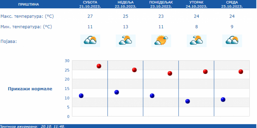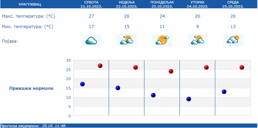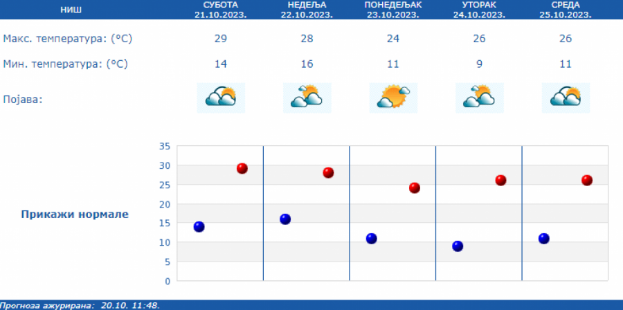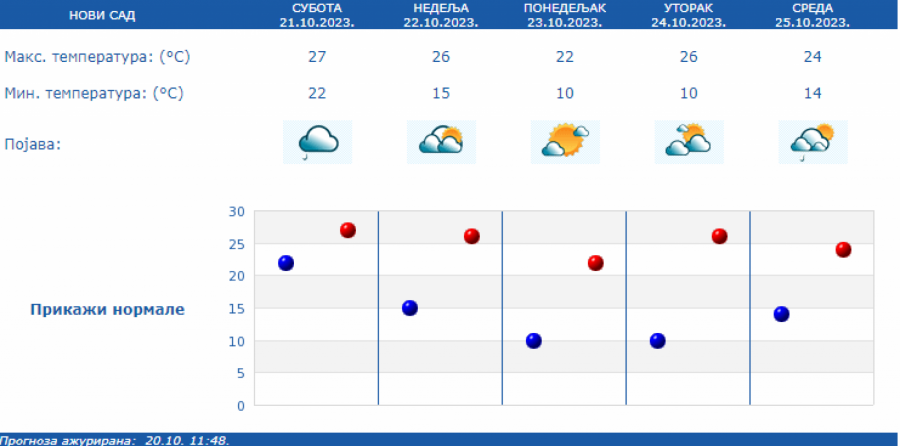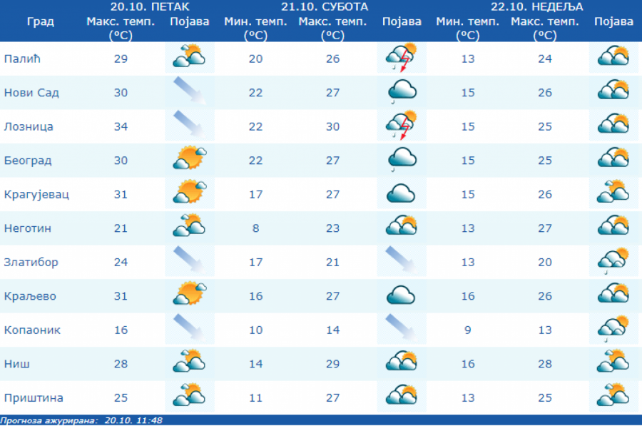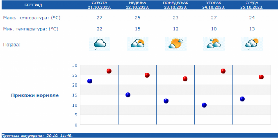 U Beogradu se isto očekuje oblačno, toplo i vetrovito sa uslovima za povremenu kratkotrajnu kišu, duvaće umeren do jak južni vetar, tokom noći u slabljenju, sa najvišom dnevnom temperaturom oko 27 stepeni.