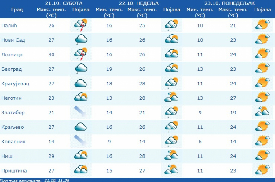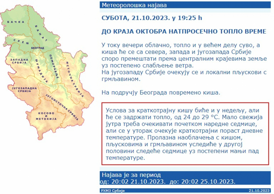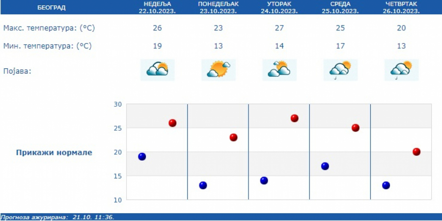 Prema prognozi RHMZ, danas će u Srbiji biti promenljivo oblačno i toplo sa dužim sunčanim intervalima, naročito pre podne i ređom pojavom kratkotrajne kiše.