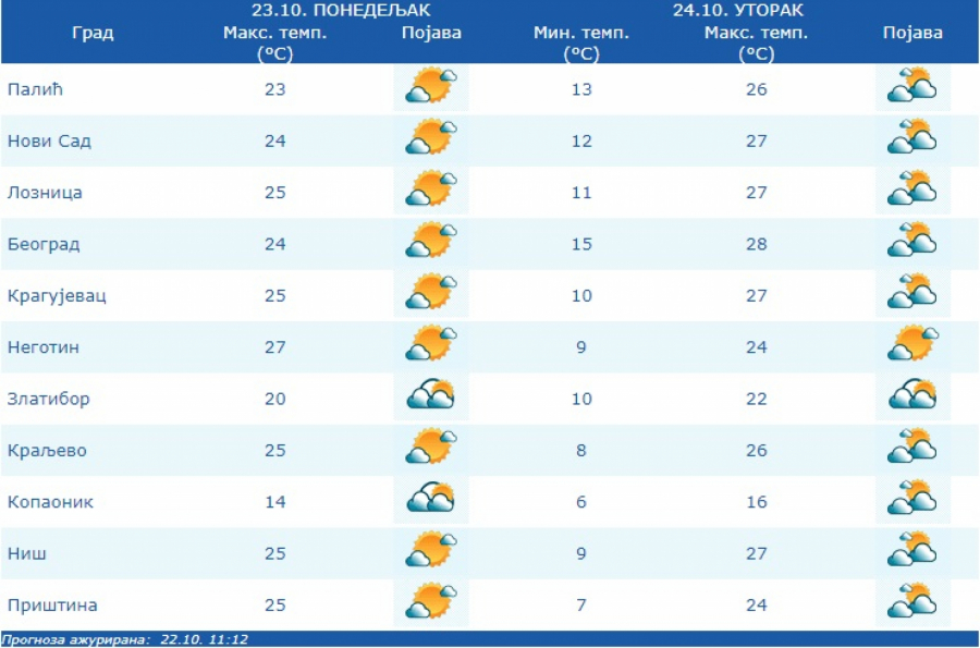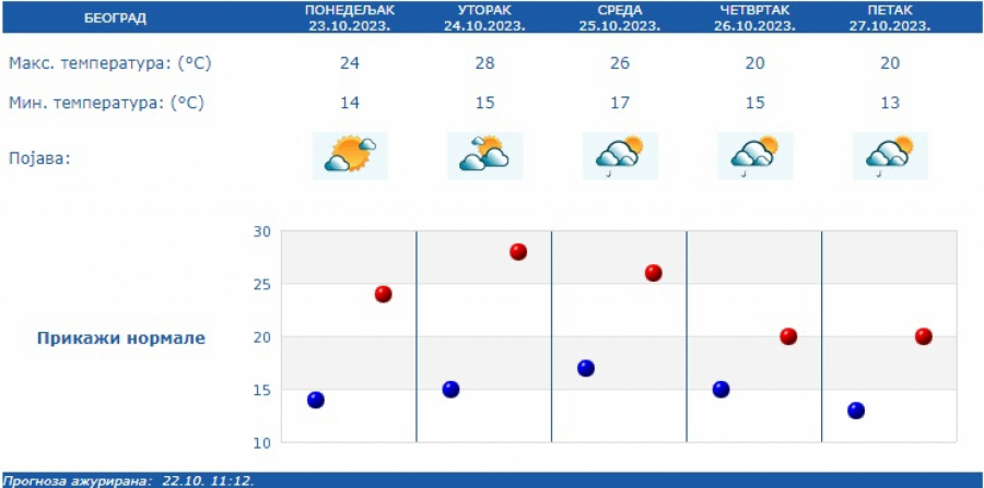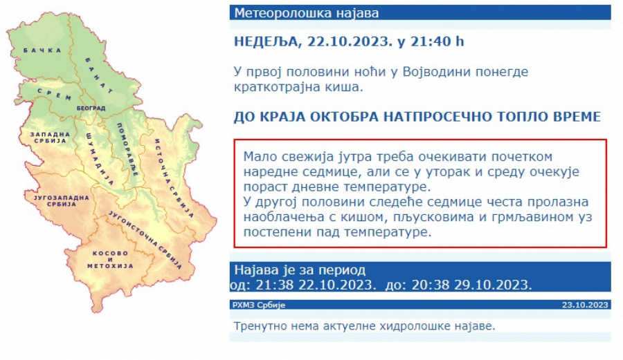 U Srbiji u narednih sedam dana, do 30. oktobra, toplo za poslednju dekadu oktobra.
