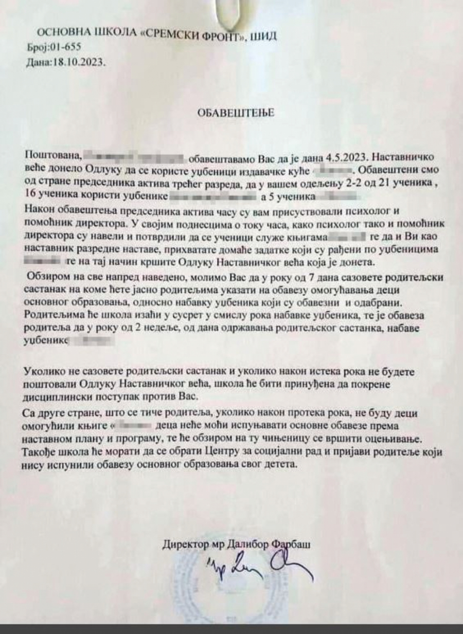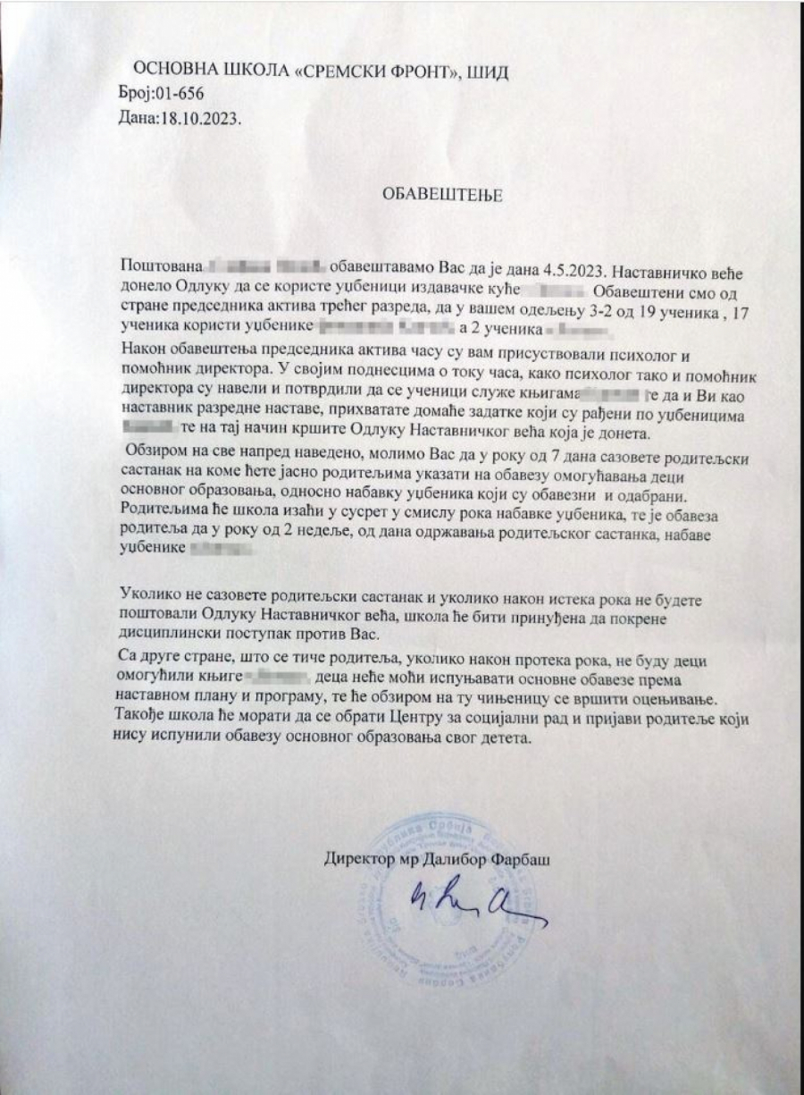 - Ukoliko nakon isteka roka ne budu omogućili deci knjige tog izdavača, deca neće moći ispunjavati osnovne obaveze prema nastavnom planu i programu, te će s obzirom na tu činjenicu vršiti ocenjivanje. Takođe, škola će morati da se obrati Centru za socijalni rad i prijavi roditelje koji nisu ispunili obavezu osnovnog obrazovanja svog deteta - naveo je direktor u dopisu.
