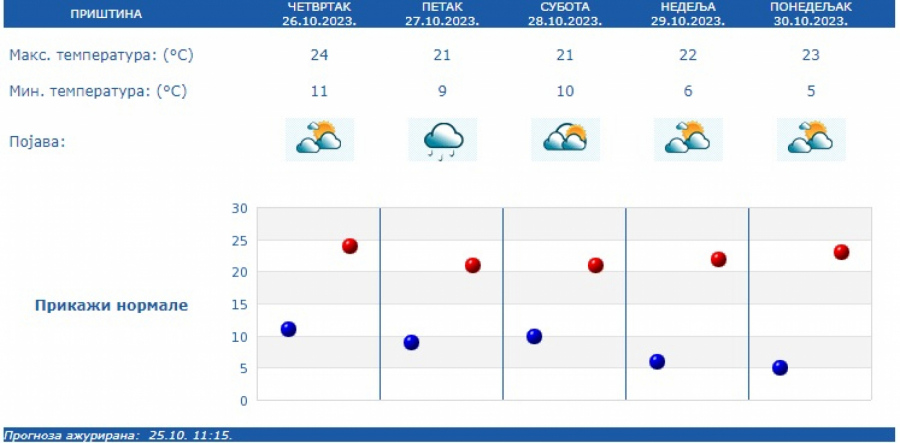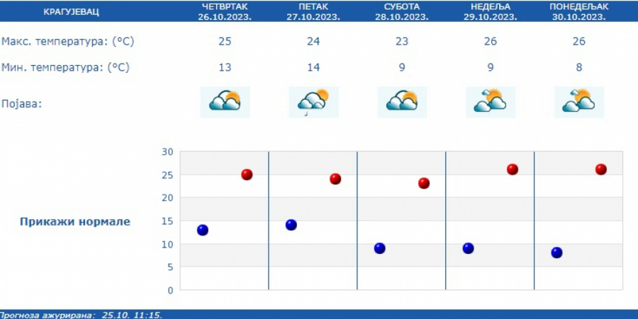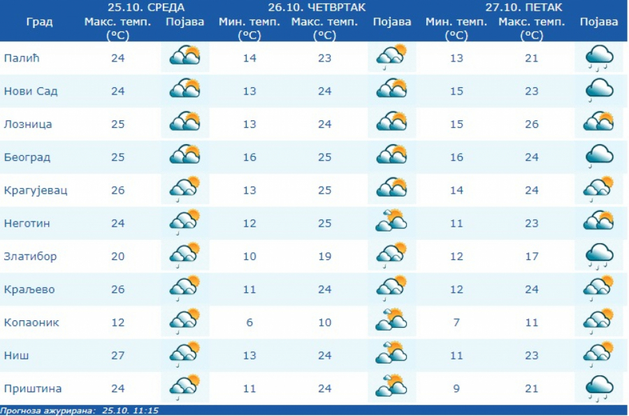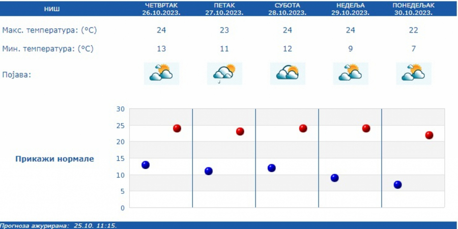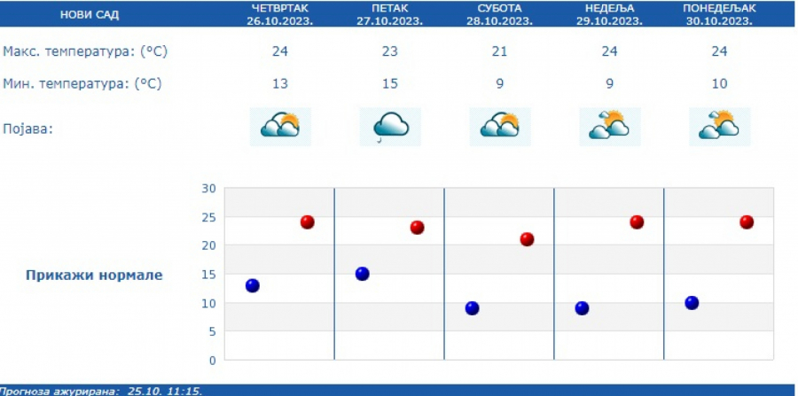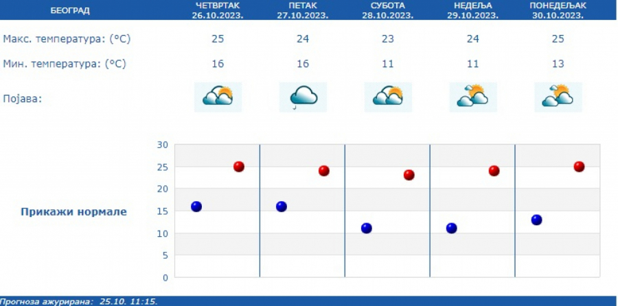 Prema izgledima vremena za narednih sedam dana, do kraja oktobra promenljivo oblačno uz manji pad temperature ali i dalje toplo.