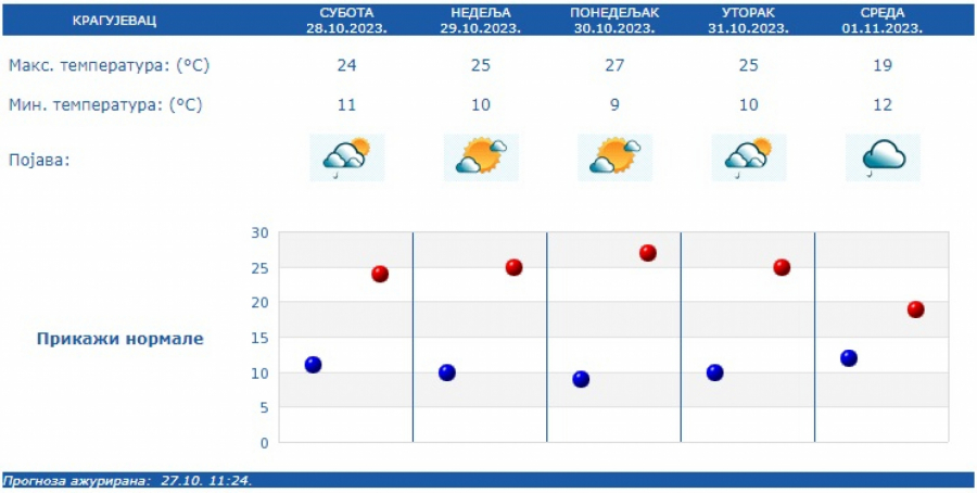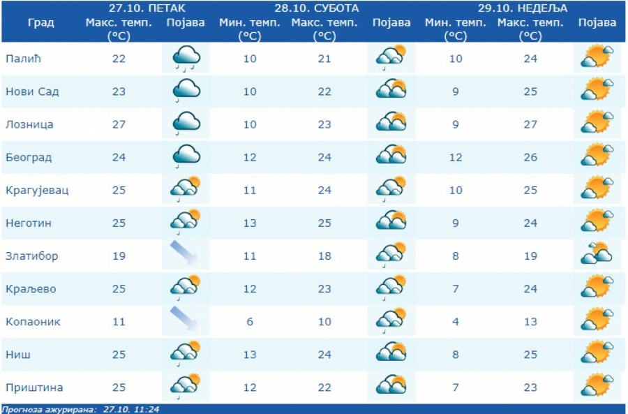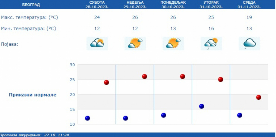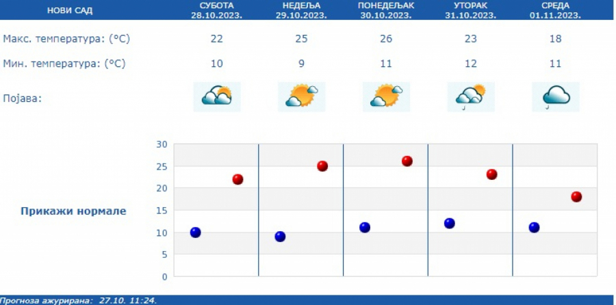 U nedelju i ponedeljak pretežno sunčano, zatim do kraja perioda promenljivo oblačno, a kiša, pljuskovi i manji pad temperature očekuju se u utorak, 31. oktobra, sredu 1. novembra i subotu 4. novembra.