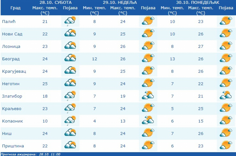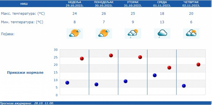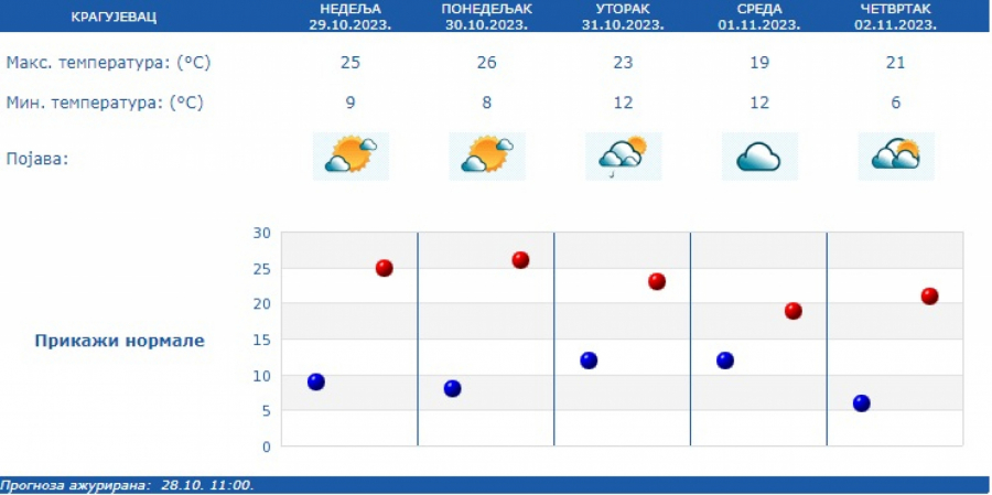 Vetar će biti slab i umeren, južnih pravaca. Najniža temperatura od 7 do 12 C, a najviša dnevna od 23 do 26 C, saopštio je Republički hidrometeorološki zavod.