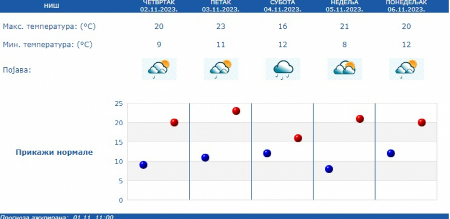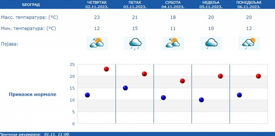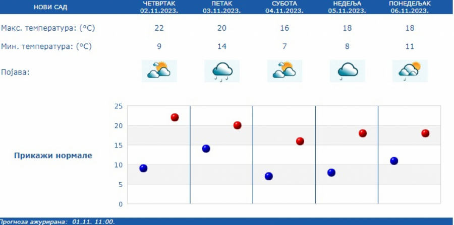 Maksimalna temperatura u vćini mesta od 16 do 24 stepena, osim na istoku, gde će biti malo svežije. Nastavak promenljivog vremena i naredne sedmice, od 6. novembra.