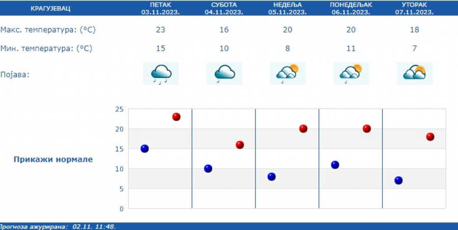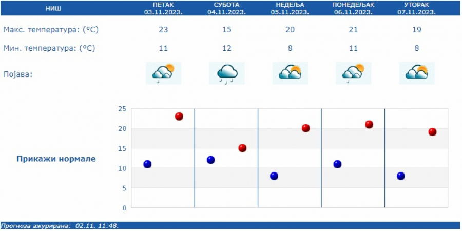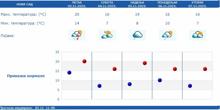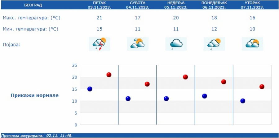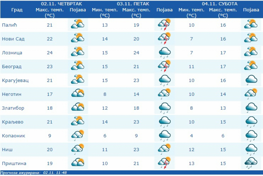 Maksimalna temperatura u većini mesta od 16 do 21 stepen. Nastavak promenljivog vremena i naredne sedmice od ponedeljka, 6. novembra.