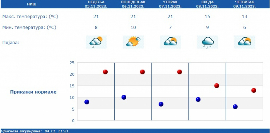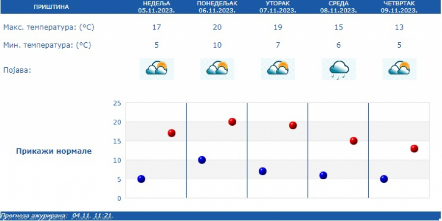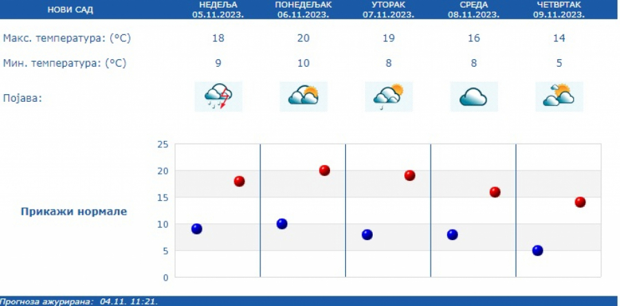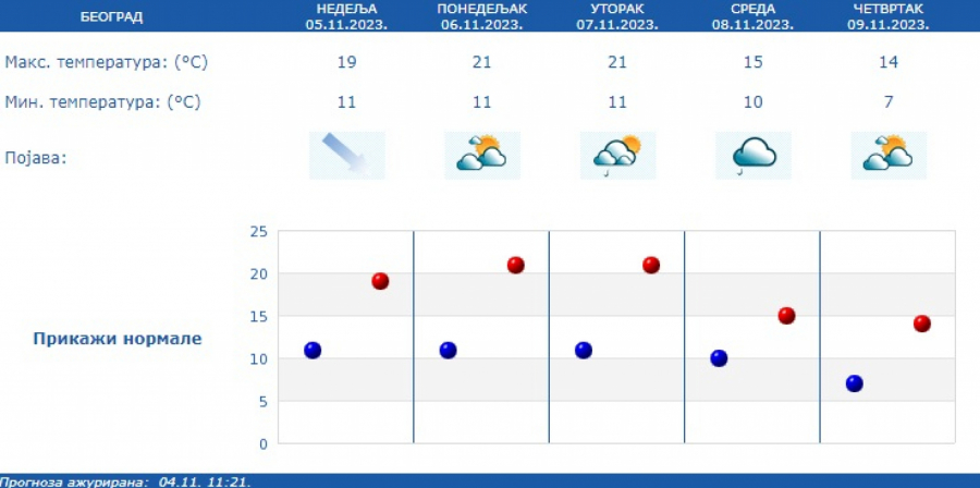 Prema prognozi Republičkog hidrometeorološkog zavoda, najniža temperatura biće od 4 do 11, a najviša od 17 do 22 stepena.