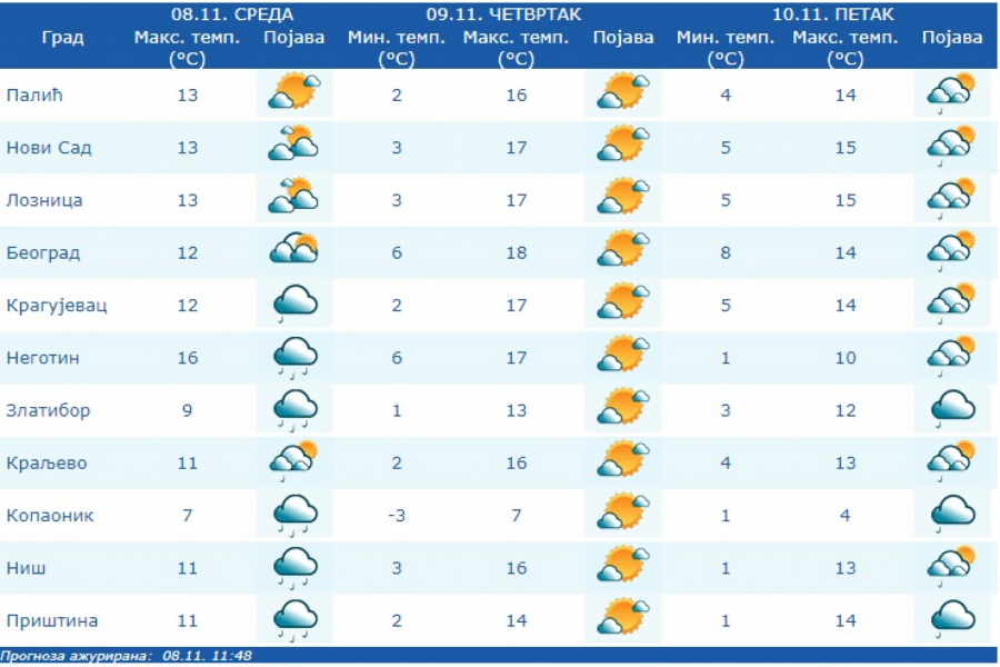 U subotu oblačno s kišom, koja će na visokim planinama preći u sneg. U nedelju pre podne prestanak padavina, posle podne i razvedravanje.