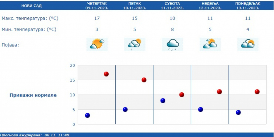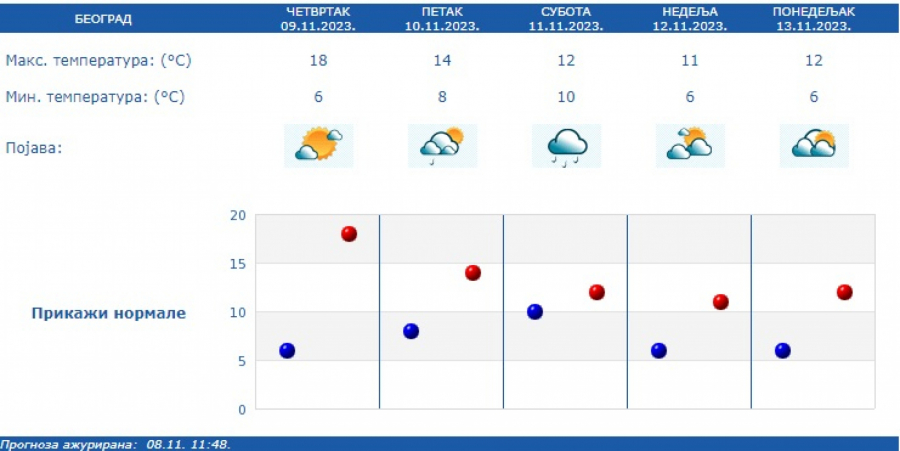 Sledeće sedmice promenljivo, povremeno s kišom, na visokim planinama kratkotrajno i snegom, a dnevne temperature biće u granicama proseka za drugu dekadu novembra.