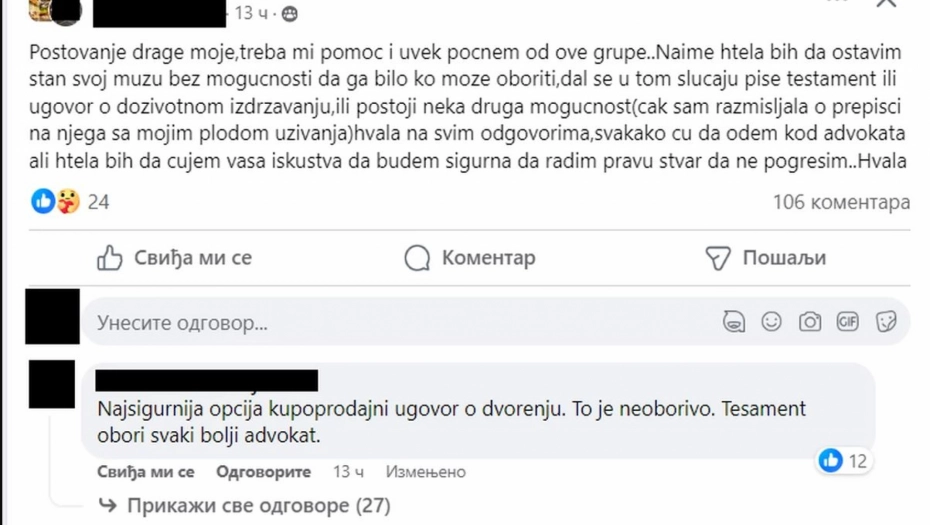 - Htela bih da ostavim stan svom mužu bez mogućnosti da ga bilo ko može oboriti, da li se u tom slučaju piše testament ili ugovor o doživotnom izdržavanju ili postoji neka druga mogućnost (čak sam razmišljala o prepisci na njega sa doživotnim plodouživanjem). Hvala na svim odgovorima, svakako ću da odem kod advokata ali htela bih da čujem vaša iskustva da budem sigurna da radim pravu stvar, da ne pogrešim. Hvala! - napisala je ona na Fejsbuk grupi Novosađanke.