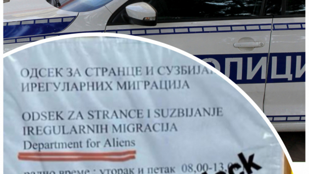 "Odsek za strance i suzbijanje iregularnih migracija". Prvo na ćirilici, pa na latinici i onda se neko dosetio da ovo obaveštenje napiše i na engleskom jeziku - "department for Aliens", u prevodu, ovo znaci "odeljenje za vanzemaljce".