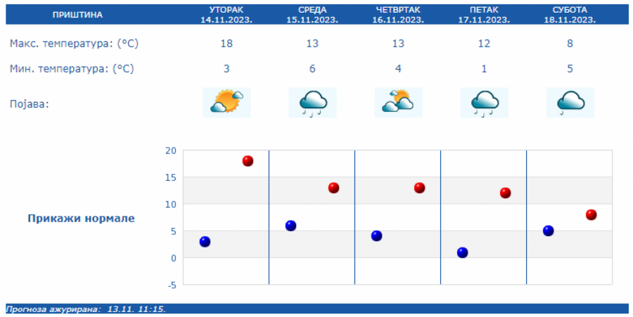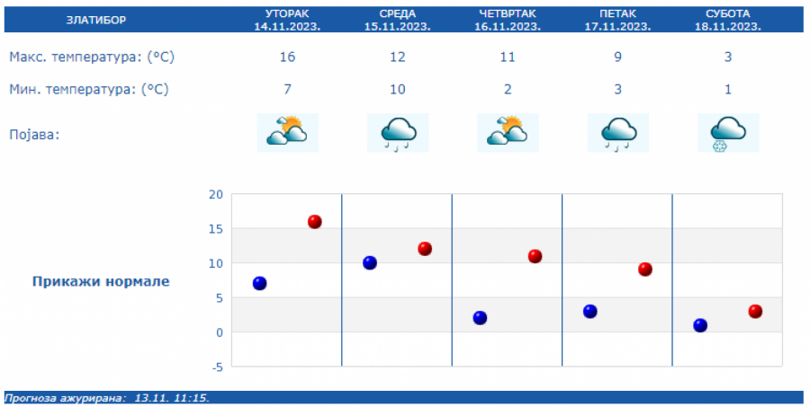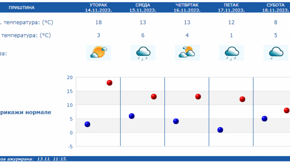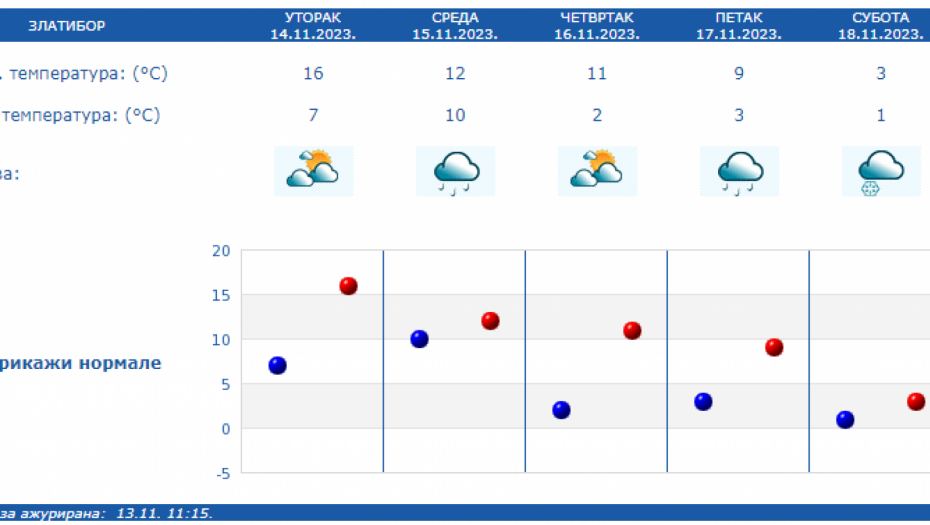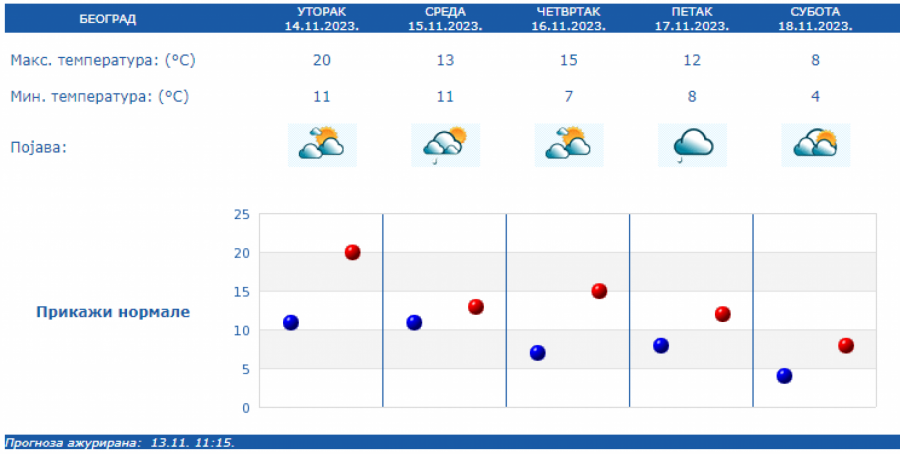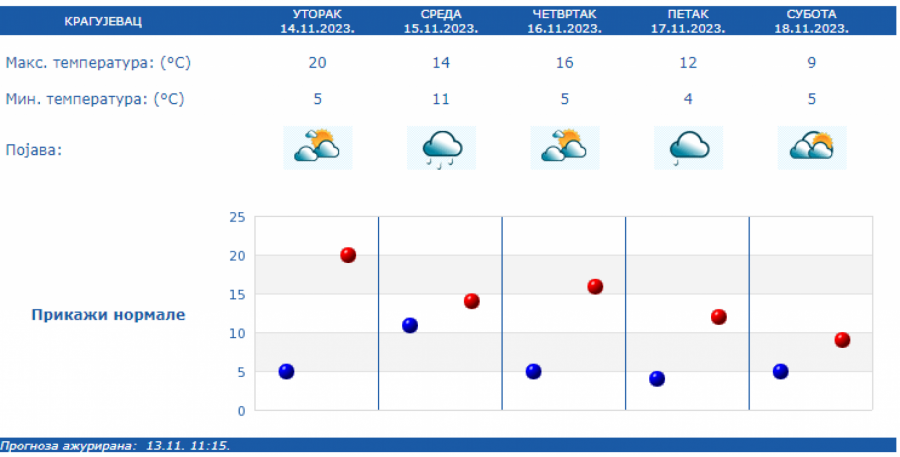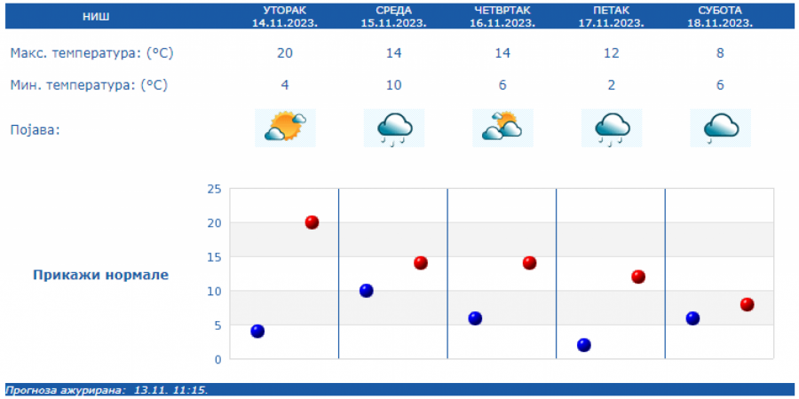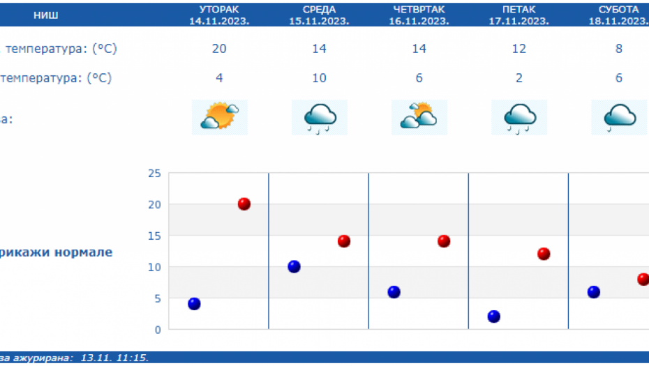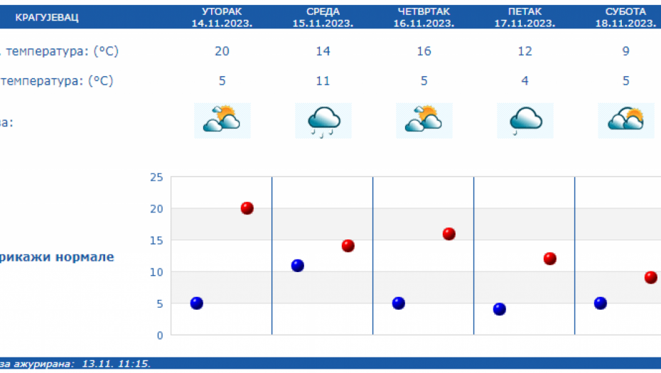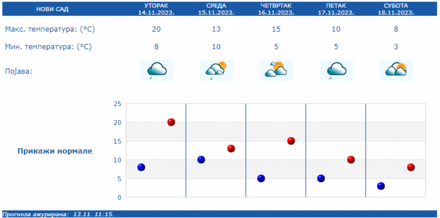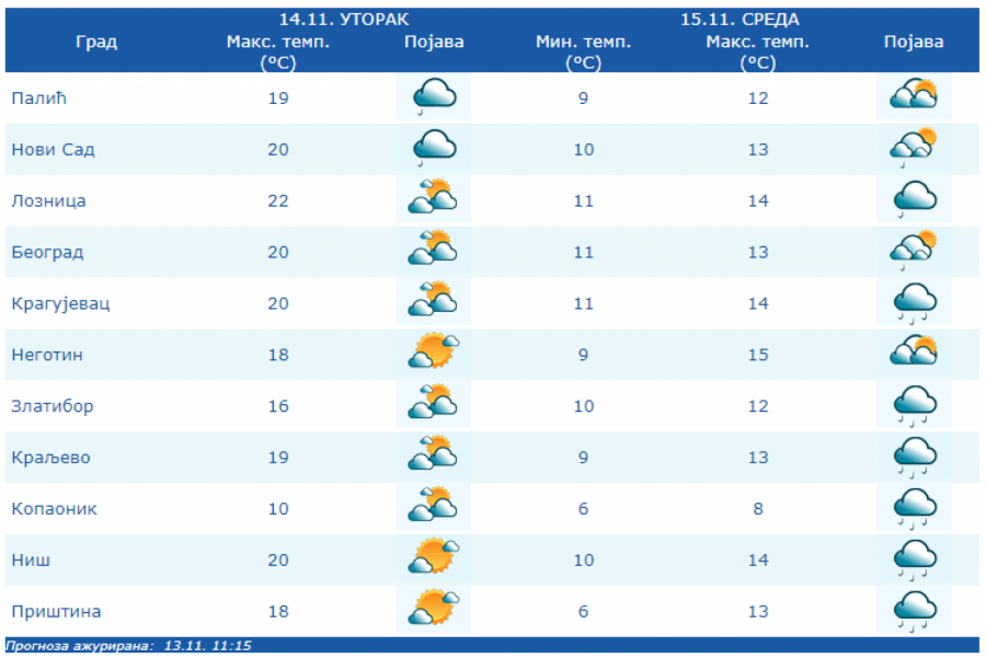 U Srbiji u sredu oblačno, mestimično sa kišom i osetno hladnije, uz slab i umeren severozapadni vetar. Na severu Vojvodine i u Negotinskoj Krajini suvo uz delimično razvedravanje. U ostalim predelima prestanak padavina očekuje se uveče.