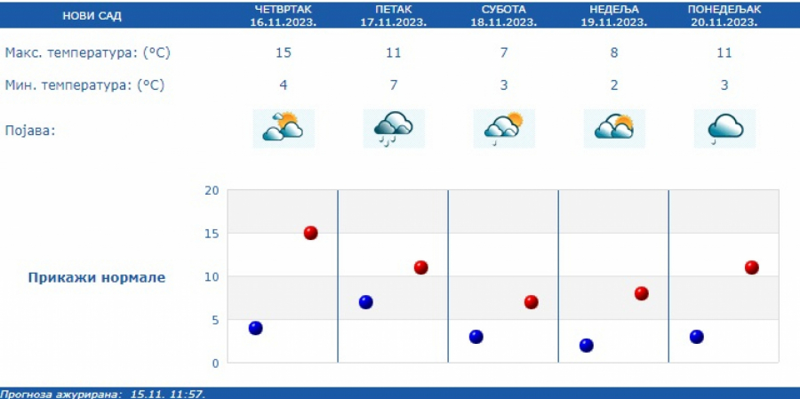 Najniža temperatura od 0 do 8, a najviša od 9 do 15 stepeni.