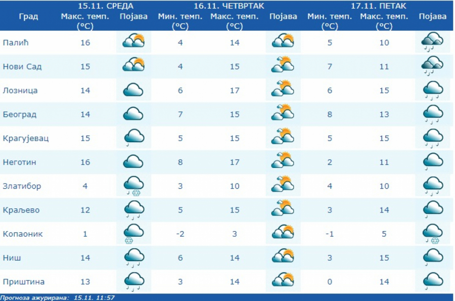 Najniža temperatura od 2 do 9, a najviša od 13 do 17 stepeni. Tokom noći postepeno naoblačenje sa zapada, u Vojvodini mestimično sa kišom.