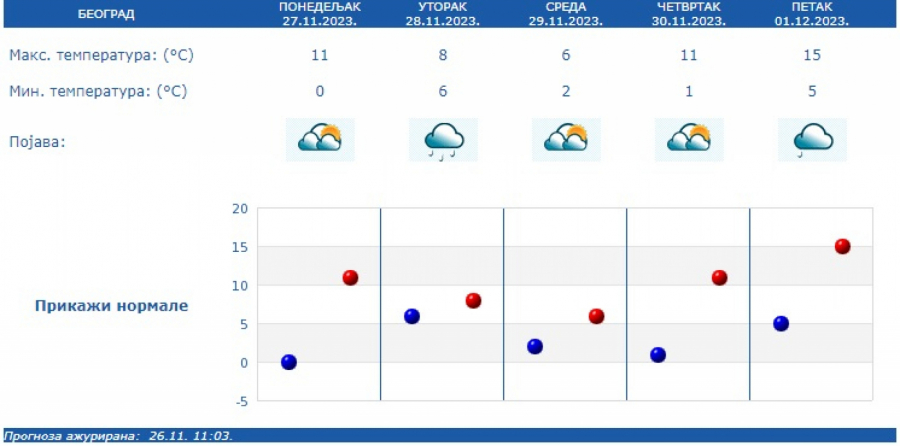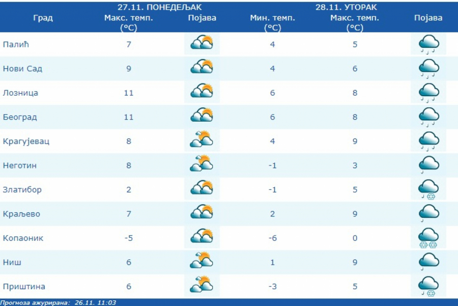 Uveče postepeno naoblačenje koje će tokom noći usloviti slabu kišu. Vetar slab i umeren, jugozapadni, a uveče u skretanju na jugoistočni pravac. Jutarnja temperatura od -3 do 0, najviša dnevna oko 11 stepeni.