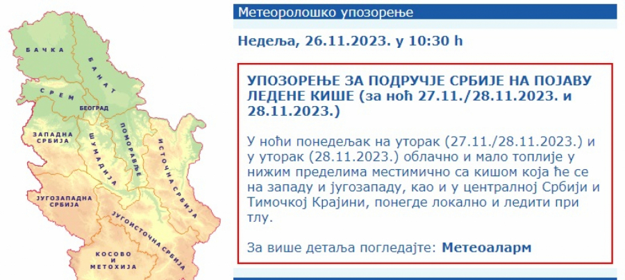 Tokom noći lokalno je moguća i pojava kiše koja će se lediti pri tlu, saopštio je RHMZ.