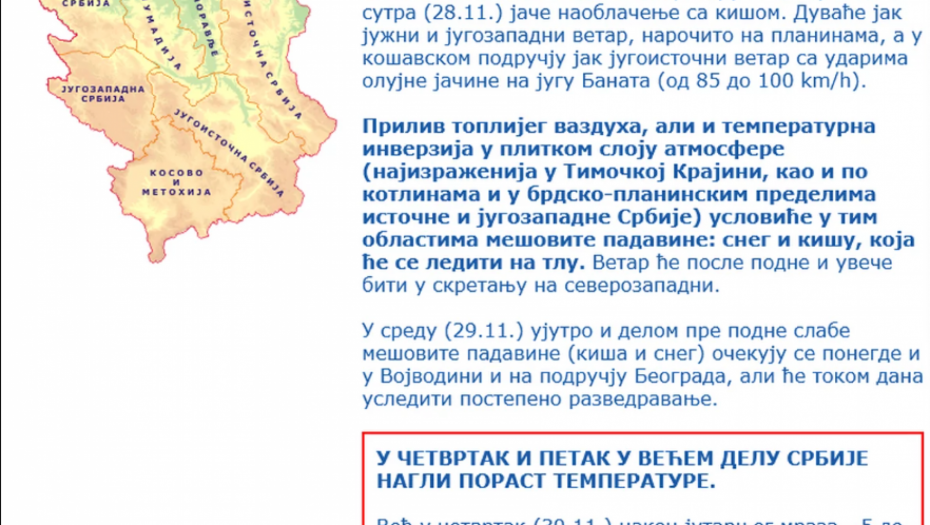 Kako su meteorolozi najavili, očekuje se priliv toplijeg vazduha, ali i temperaturna inverzija u plitkom sloju (najizraženija u Timočkoj Krajini, kao i po kotlinama i u brdsko-planinskim predelima istočne i jugozapadne Srbije) usloviće u tim oblastima mešovite padavine: sneg i kišu, koja će se lediti na tlu. Vetar će posle podne i uveče biti u skretanju na severozapadni.