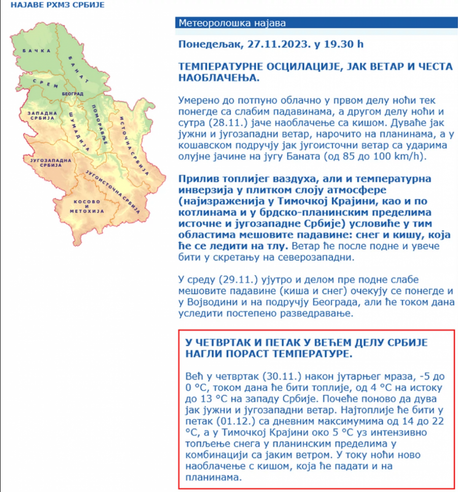 Već u četvrtak (30.11.) nakon jutarnjeg mraza, -5 do 0 °S, tokom dana će biti toplije, od 4 °S na istoku do 13 °S na zapadu Srbije. Počeće ponovo da duva jak južni i jugozapadni vetar. Najtoplije će biti u petak (01.12.) sa dnevnim maksimumima od 14 do 22 °S, a u Timočkoj Krajini oko 5 °S uz intenzivno topljenje snega u planinskim predelima u kombinaciji sa jakim vetrom. U toku noći novo naoblačenje s kišom, koja će padati i na planinama.