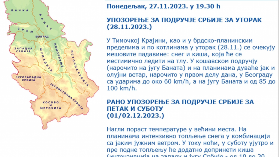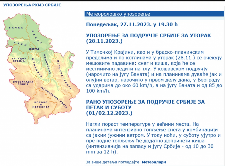 - Umereno do potpuno oblačno u prvom delu noći tek ponegde sa slabim padavinama, a drugom delu noći i sutra (28.11.) jače naoblačenje sa kišom. Duvaće jak južni i jugozapadni vetar, naročito na planinama, a u košavskom području jak jugoistočni vetar sa udarima olujne jačine na jugu Banata (od 85 do 100 km/h) - navodi se u RHMZ najavi.