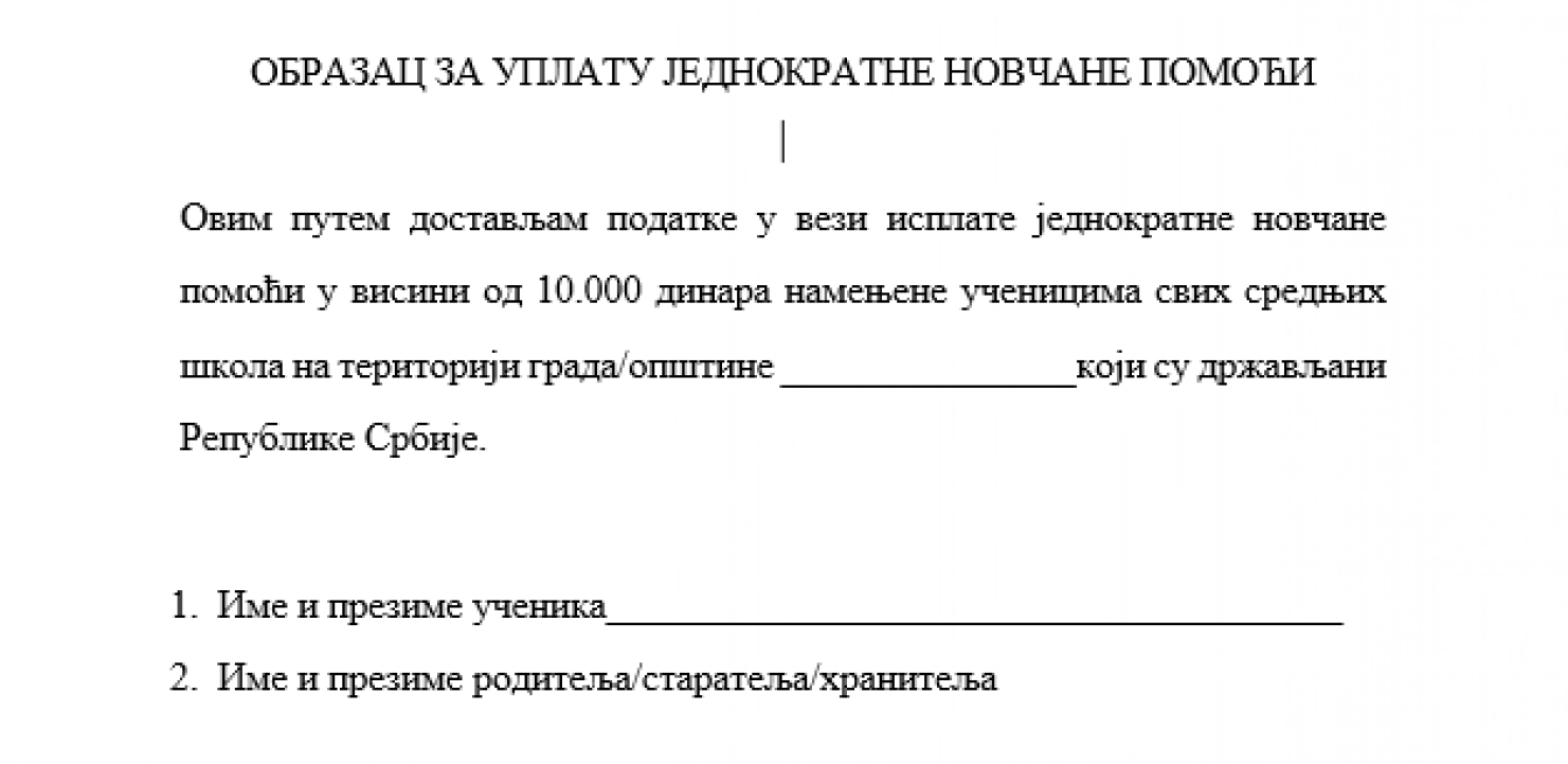 OVO JE FORMULAR ZA PRIJAVU SREDNJOŠKOLACA Danas počinju prijave za pomoć države od 10.000 dinara