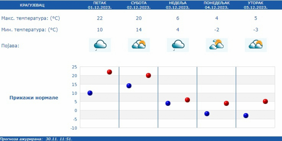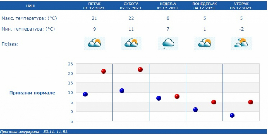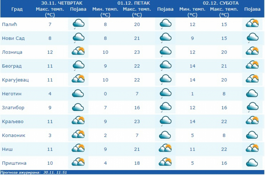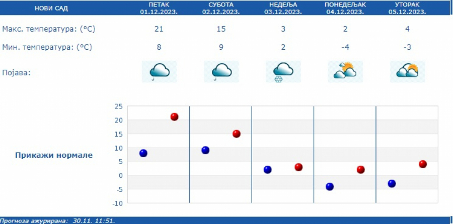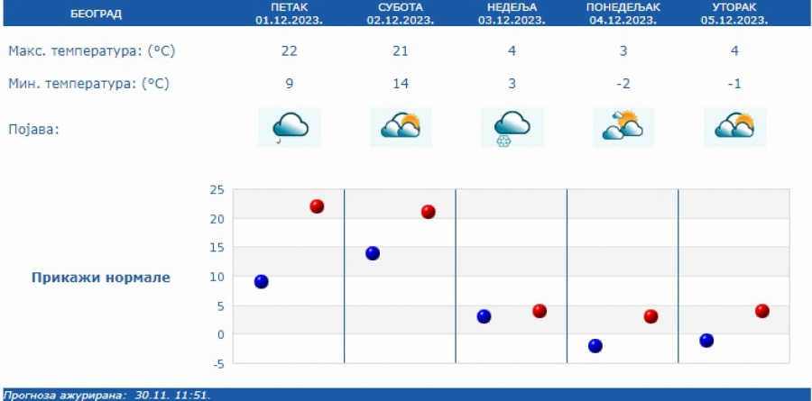 Najniža temperatura od 0 do 10 stepeni, a najviša od 15 stepeni na jugu, do 24 stepena na zapadu Srbije, dok će u Timočkoj Krajini biti osetno hladnije sa maksimalnom temperaturom oko 7 stepeni.