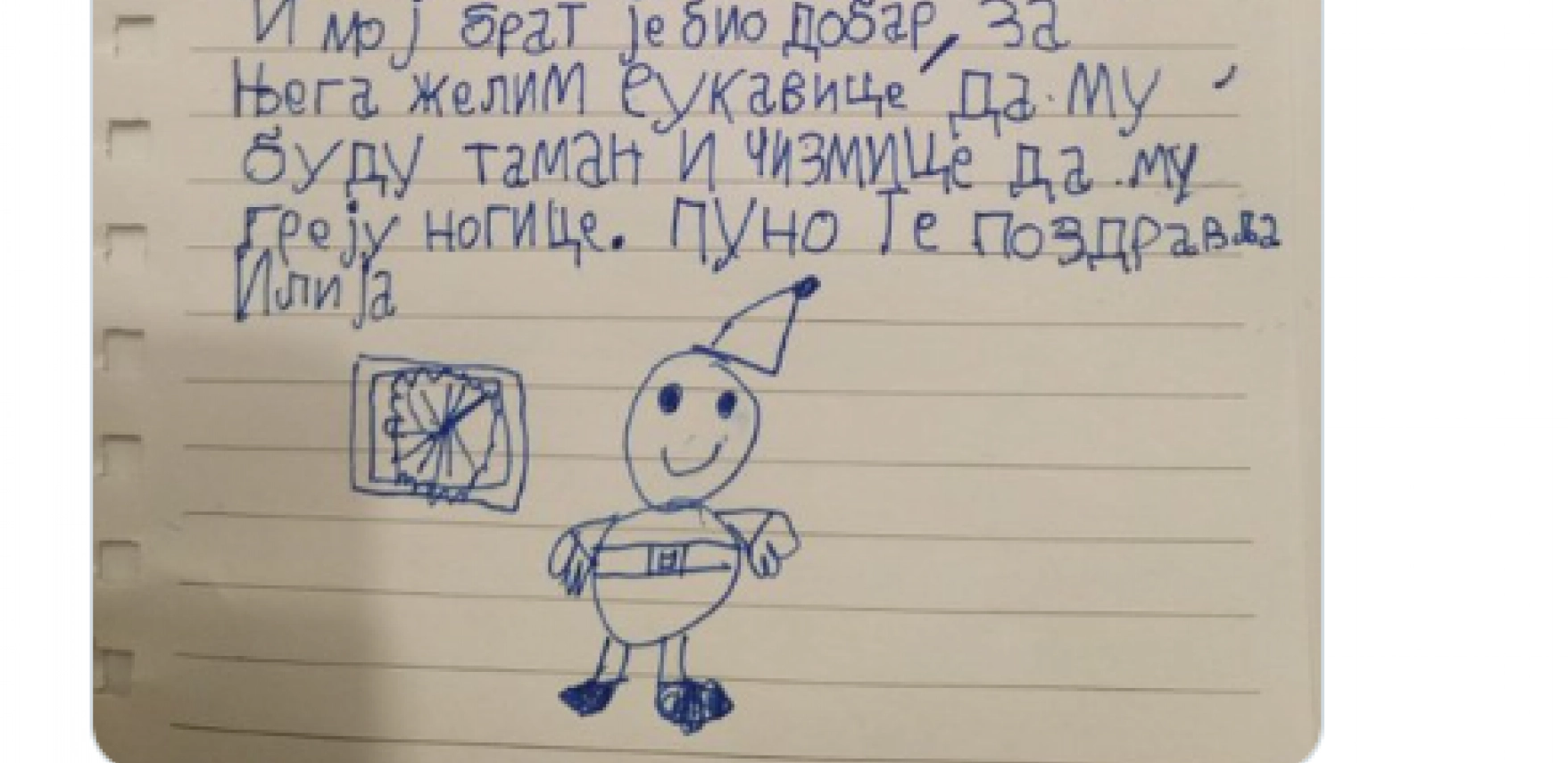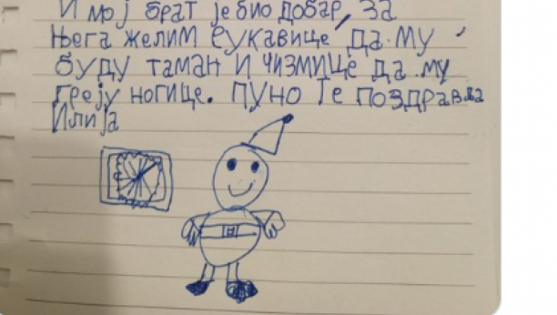 "Dragi Deda Mraze, ove godine sam bio dobar. Krenuo sam u školu, radim domaći i naučio sam sva slova. Voleo bih na poklon da dobijem lego figurice dogmena. Ako nema lego, onda obične figurice. I moj brat je bio dobar, za njega žeim rukavice da mu budu taman i čizmice da mu greju nogice. Puno te pozdravlja Ilija.", napisao je ovaj prvak, uz prigodan crtež nasmejanog Deda Mraza.