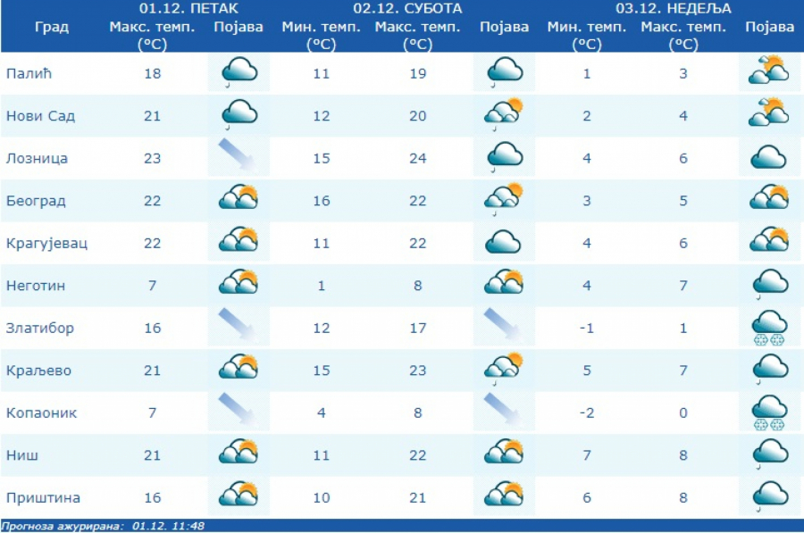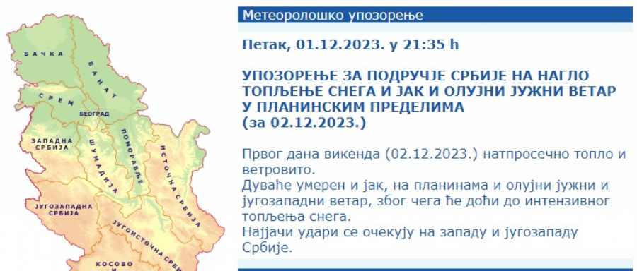 Prvog dana vikenda (02.12.2023.) natprosečno toplo i vetrovito. Duvaće umeren i jak, na planinama i olujni južni i jugozapadni vetar, zbog čega će doći do intenzivnog topljenja snega.