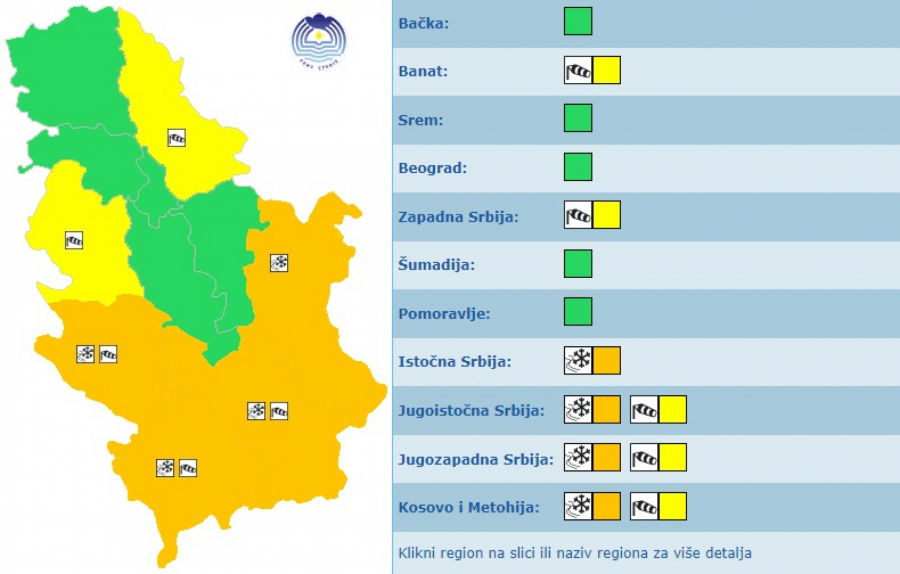 Najjači udari se očekuju na zapadu i jugozapadu Srbije, navodi se.