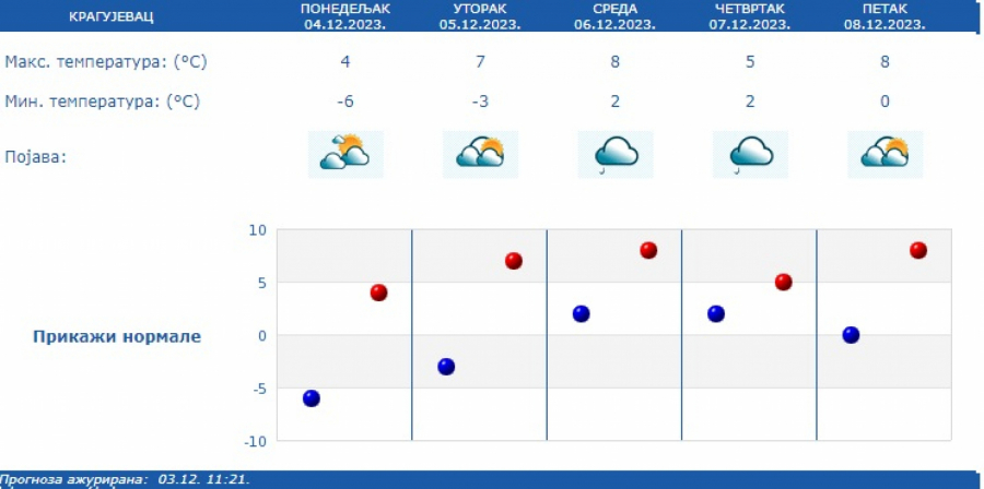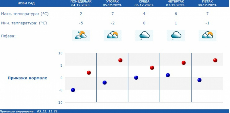 Zatim do kraja sedmodnevnog perioda, 11. decembra, umereno do potpuno oblačno, u subotu u južnim predelima, a u nedelju i u centralnim krajevima mestimično sa slabom kišom, na planinama sa slabim snegom.
