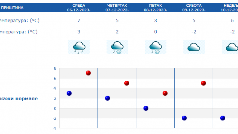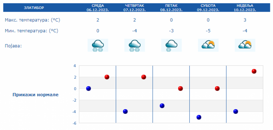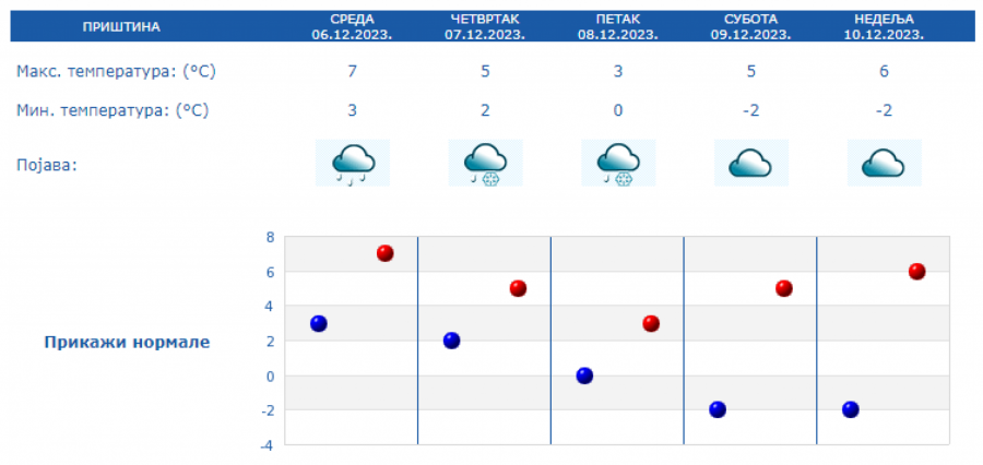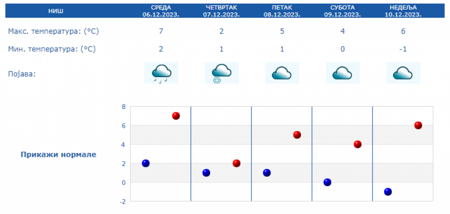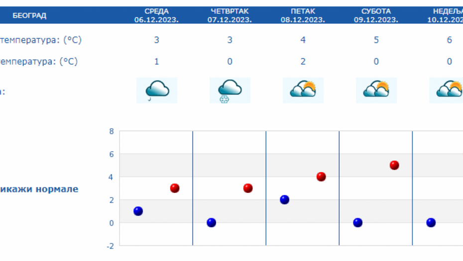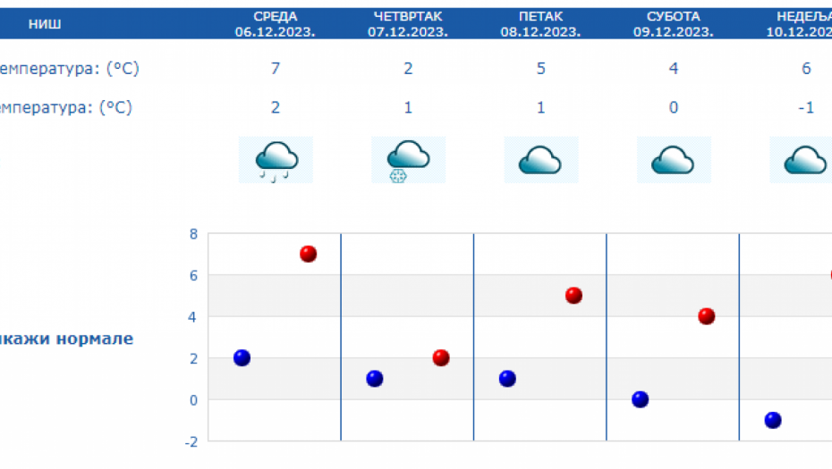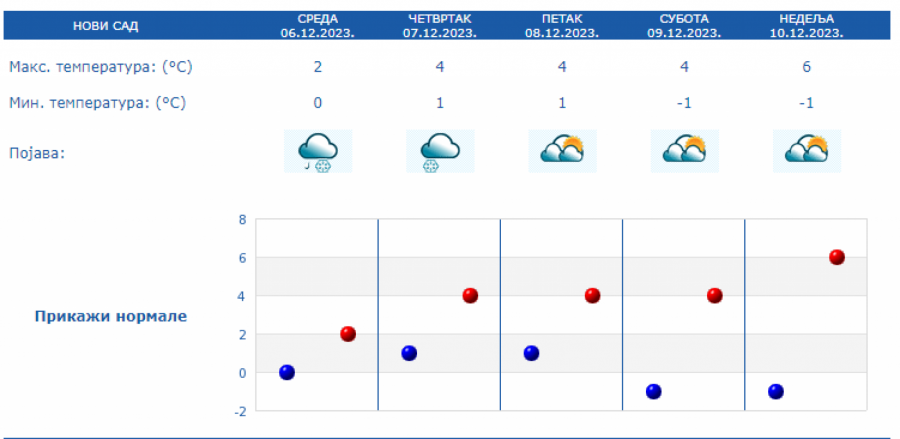Prema prognozi za narednih sedam dana, u četvrtak će biti oblačno i hladno s kišom, susnežicom i snegom. Na planinama manje povećanje, a u nižim predelima, južnije od Save i Dunava, ponegde kratkotrajno formiranje manjeg snežnog pokrivača.