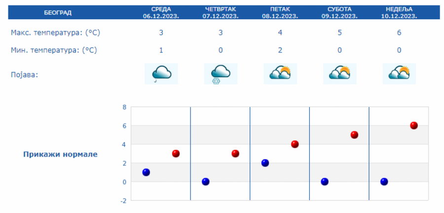 U Beogradu će ujutro biti umereno, a tokom dana potpuno oblačno i hladno. Pre podne uglavnom suvo, zatim s kišom, koja će kasnije po podne ili uveče kratkotrajno preći u susnežicu i sneg. Jugoistočni vetar biće u slabljenju, još ujutro jak, a po podne u skretanju na jugozapadni. Najniža temperatura oko 1 °C, najviša oko 3 °C.