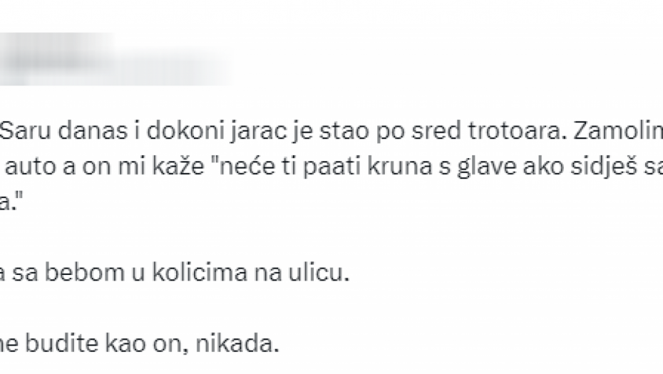 Kako je Novosađanka objasnila na svom "X" profilu (bivši Tviter), šetajući dete u kolicima, na trotoaru je naišla na parkiran automobil od kog nije mogla da prođe. Kako je videla da je u autu vozač tako ga je najljubaznije zamolila da se preparkira. Međutim ono što joj je on rekao, šokiralo ju je i iznerviralo.