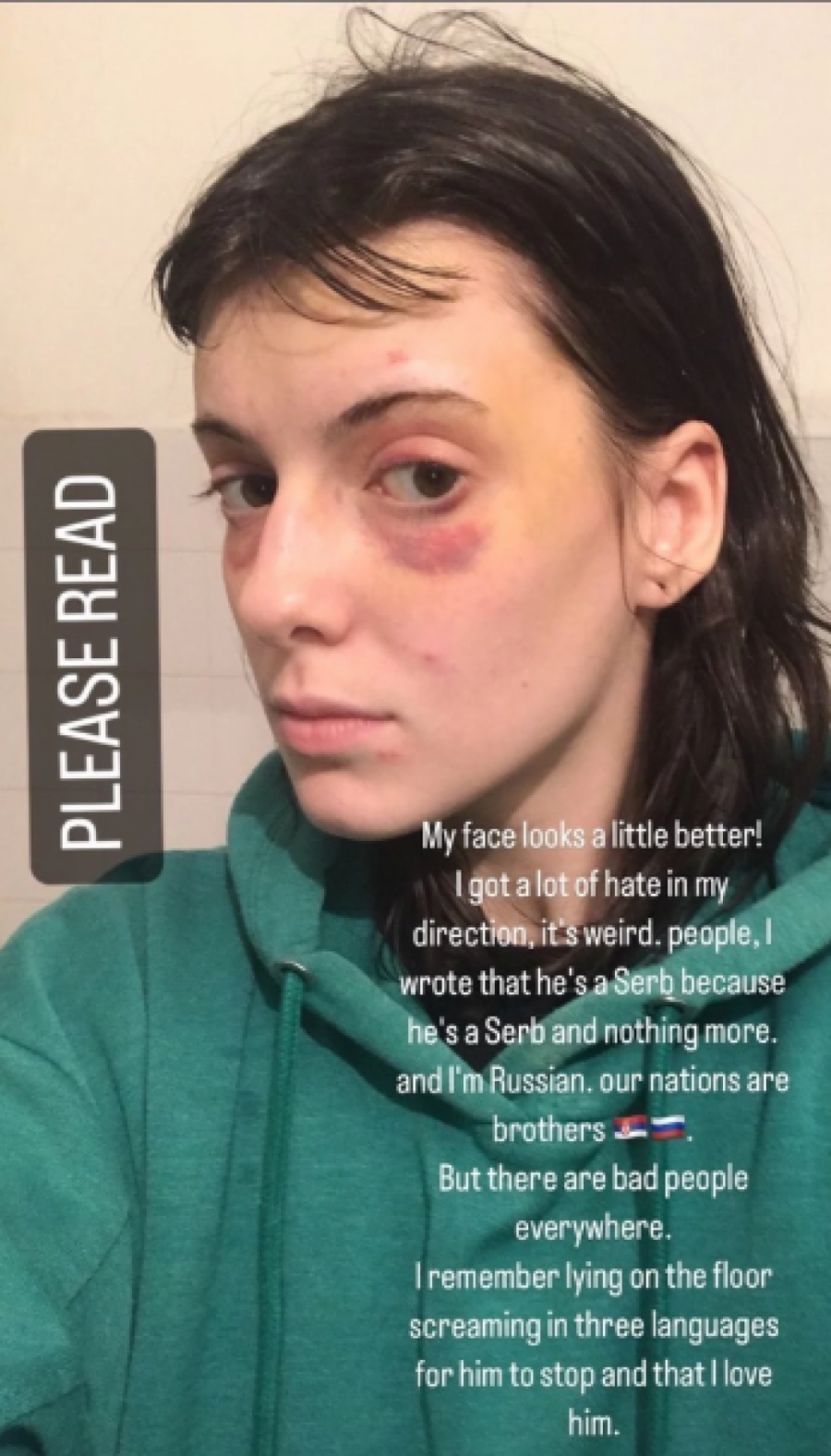 - Lice mi izgleda bolje. Ali mi je upućeno puno poruka mržnje posle svega, što je čudno. Napisala sam da je Srbin jer jeste Srbin i ništa više. Ja sam Ruskinja, naši narodi su braća. Ali loših ljudi ima svuda - napisala je devojka na svojoj društvenoj mreži, pa se još jednom dotakla nasilja koje je preživela.
