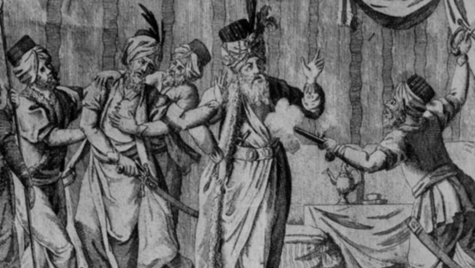 Trojica janjičara, budućih dahija, Kučuk Alija, Fočić-aga i Mula Jusuf upali su u pašin konak tražeći mu blago stavaljući mu sablju na grudi. Iskoristivši priluku dok pokazuje gde se nalazi blago, Kučuk-Alija opali hitac i na mestu su ubili pašu, a potom mu odrubili glavu. Krvavo telo Hadži-Mustafe odneli su u kupatilo gde je ostavljeno do, ironično, svečane sahrane, dva dana kasnije.