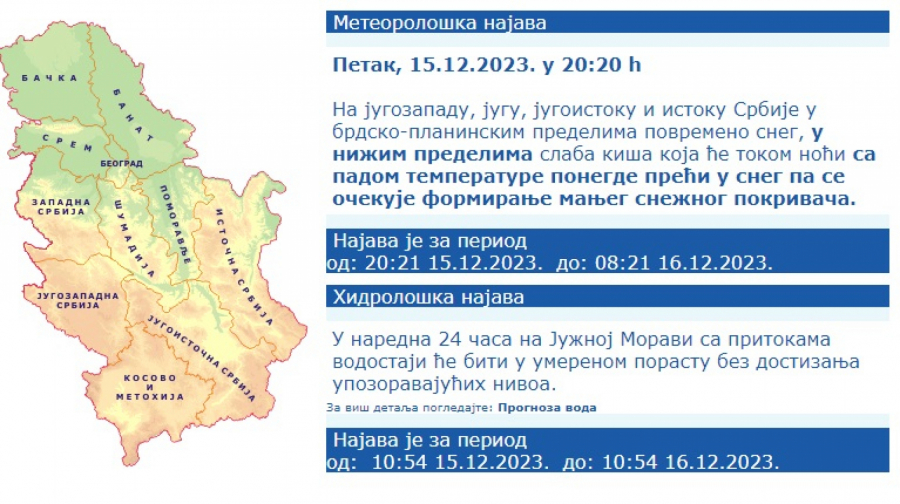"Na jugozapadu, jugu, jugoistoku i istoku Srbije u brdsko-planinskim predelima povremeno sneg, u nižim predelima slaba kiša koja će tokom noći sa padom temperature ponegde preći u sneg pa se očekuje formiranje manjeg snežnog pokrivača", navodi se na sajtu RHMZ-a.