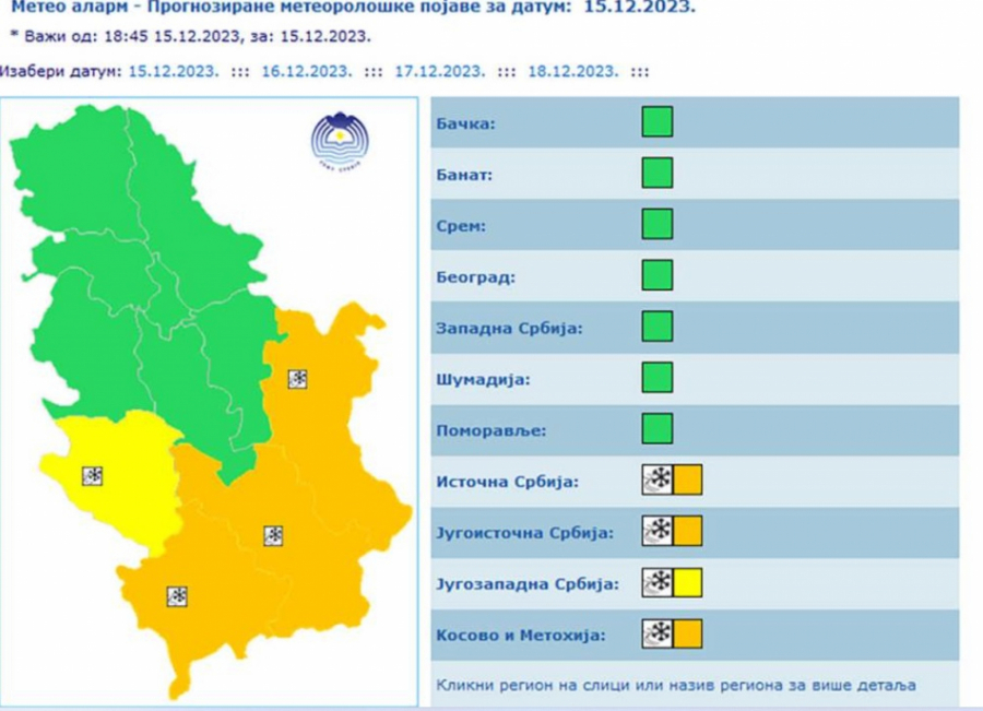 Trenutno su na snazi dva meteoalarma, žuti i narandžasti. Žuti meteoalarm je upaljen u jugozapadnoj Srbiji zbog snega, odnosno leda.